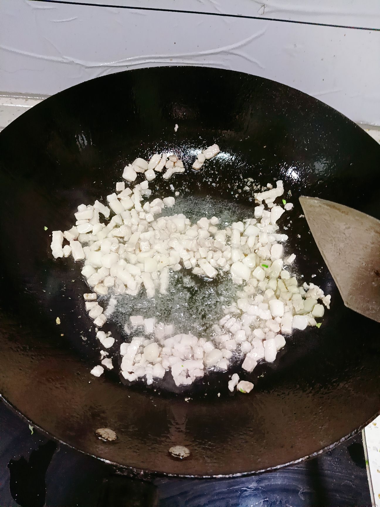 鍋中放豬油,把肉多餘的煸炒出多餘的油
