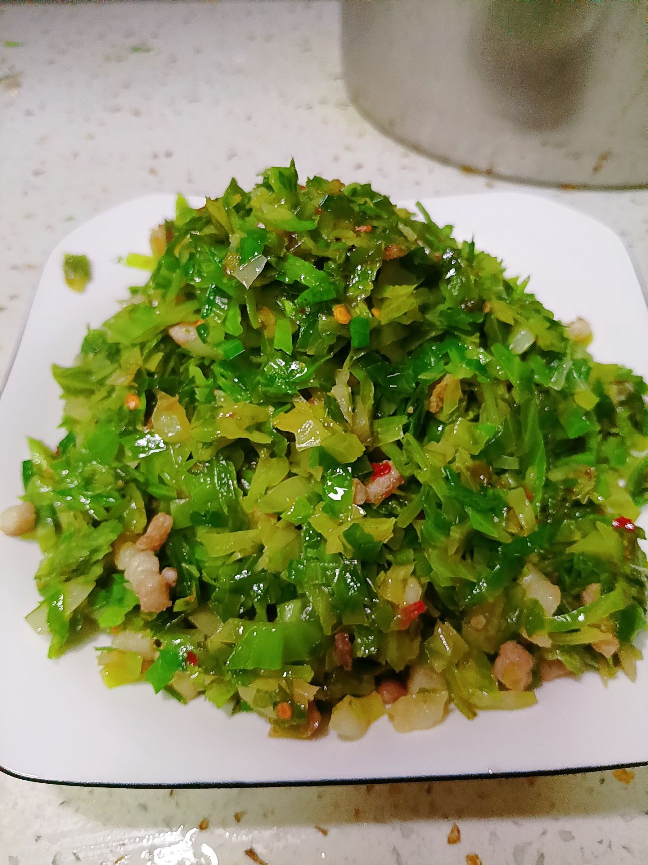 包菜外面老一層,這個包菜必須是老,太嫩了,燙熟不好喫。水開,燙1-2分鐘左右撈出來放冷水裏。這個包菜可以放罈子放幾天,讓它有點酸味。也可以像我一樣,直接燙熟就直接做。肉切丁。