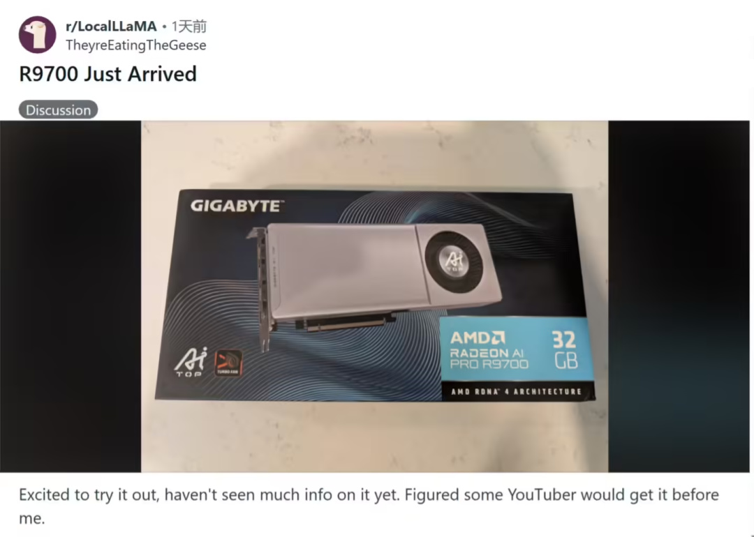 海外Reddit用户u/TherreEatingTheGeese 发帖表示,他花费了高达1220美元购买了由技嘉出产的Radeon AI PRO R9700 AI TOP 32G,这款显卡此前被认为仅限于供应OEM和集成系统方案,但是用户是在零售渠道所购买。