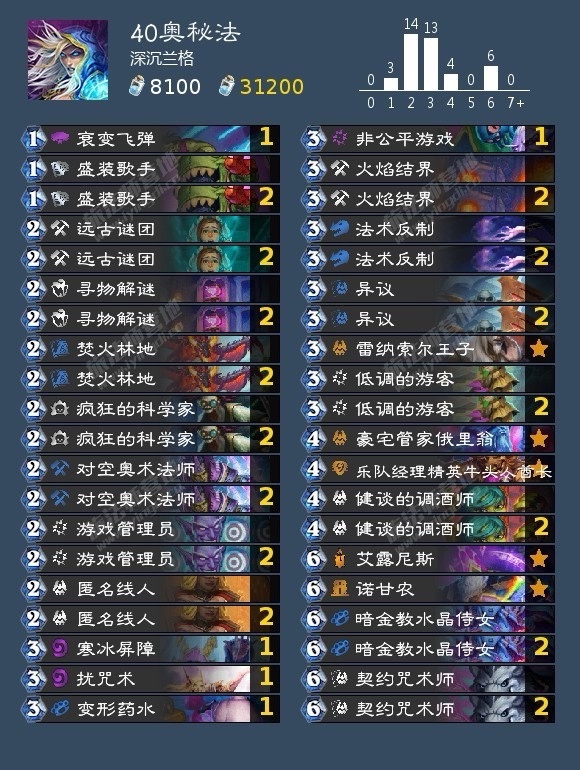 牛裏是迴盪、基丹和魔精大師。打法就和以前奧祕法的思路一樣,只不過現在40奧祕法偏控制,所以不帶雲霧王子和僕從那幾個了,otk多的環境還是可以上分。
