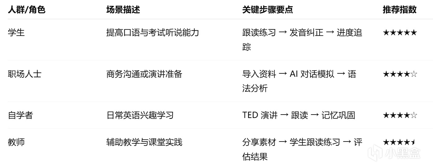Enjoy 人人都能用英语通过 AI 技术将传统语言学习中的“反馈滞后”问题转化为即时反馈体验。它既适合需要备考或提升口语的学生,也适合需要提升商务表达的职场人士。同时,教师也能借助该工具辅助课堂练习。需要注意的是,Enjoy 仍然依赖用户的自律与实践,若缺乏持续使用可能难以见到显著成效。整体而言,它是一个面向多场景的智能外语学习工具,尤其适合重视听说训练的学习者。