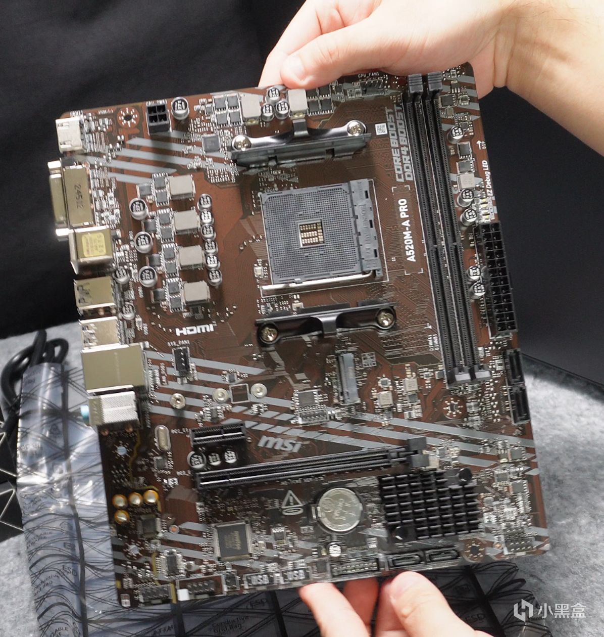 5600搭配的主板是微星A520M-A PRO,这是一块MATX主板。4+2相供电,右上角有一个BIOS指示灯,上面和中间分别有1个4针风扇供电接口。CPU支持AM4,带2根D4内存插槽(最大64GB)。1个M2接口(PCIE3.0),4个SATA接口。