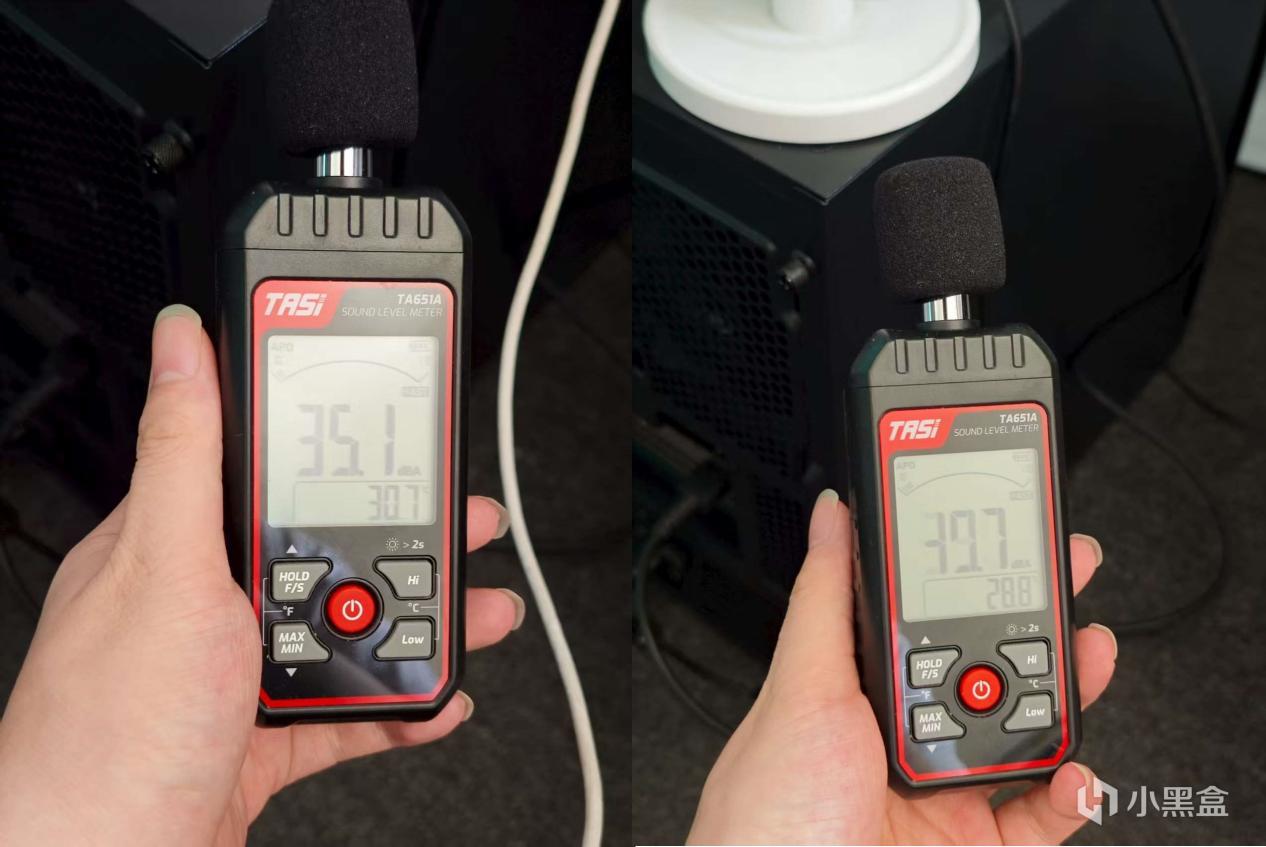 电脑待机时,噪声为35dB。电脑负载时,噪声为40dB。负载时噪声也比较小,风速倒是挺快的。
