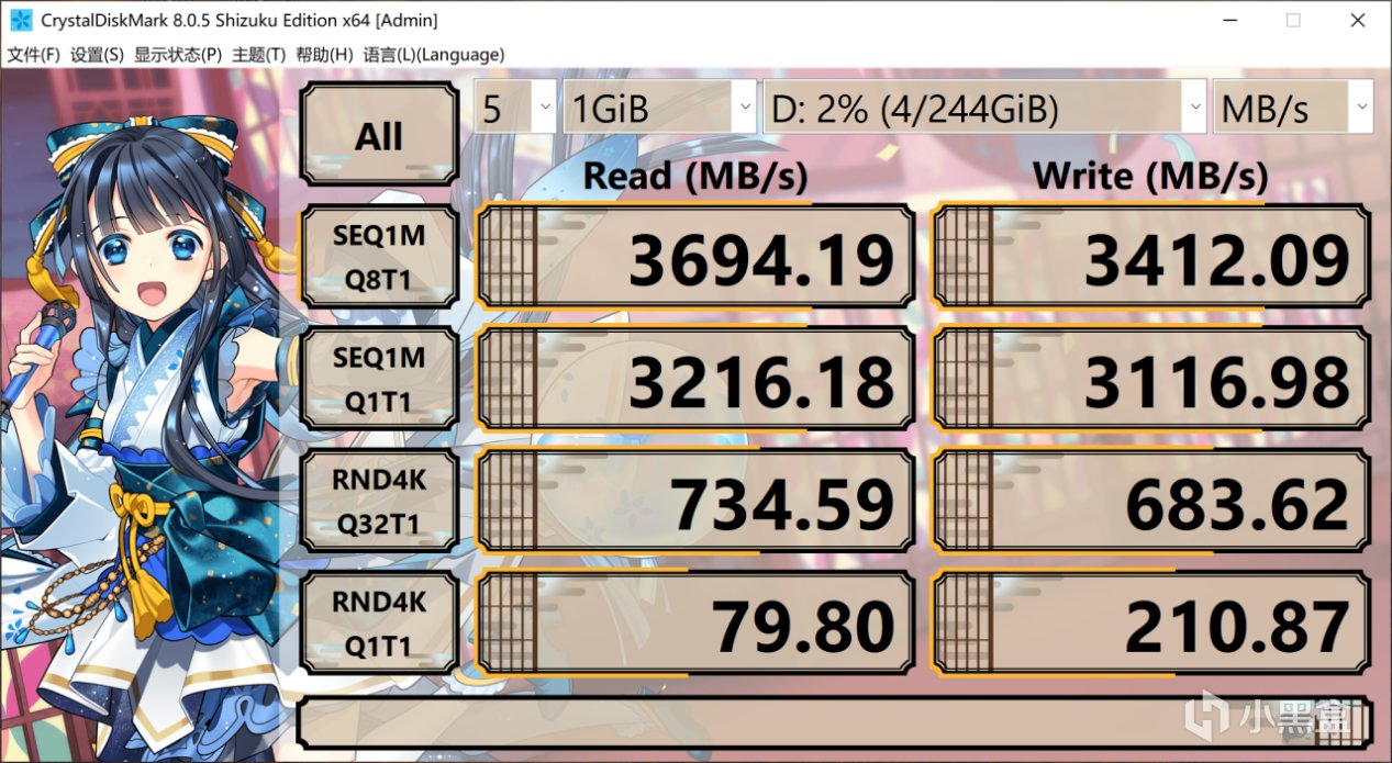 用CrystalDiskMark测试固态硬盘的读写速度,读取速度在3694.19MB/s,写入速度在3412.09MB/s。因为平台原因进行了限速,SN770原本的5000MB/s的读写速度进行的限速。虽然说是降维打击,不过3500MG/s的读写速度比PCIE3.0固态的2000MB/s的读写速度还是要高很多的,当然大家还是把预算留着买1TB版本的PCIE3.0固态硬盘。