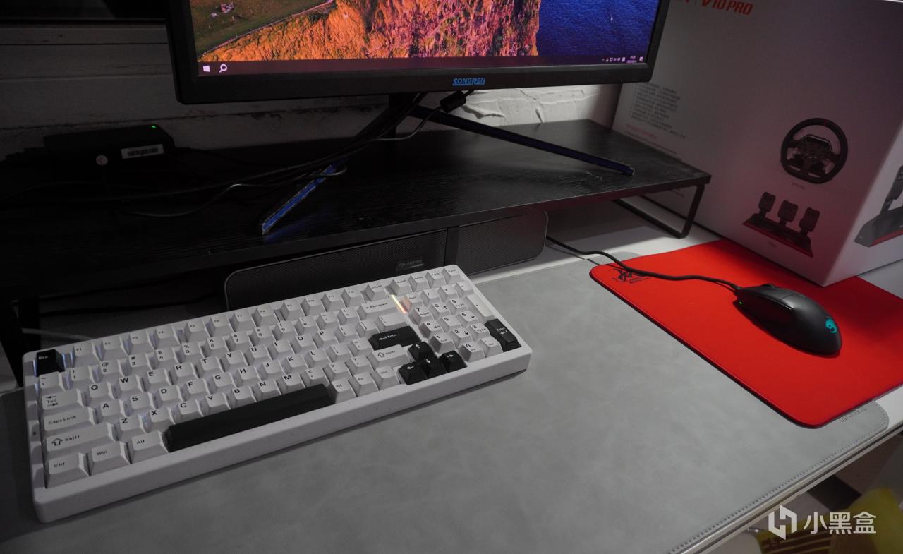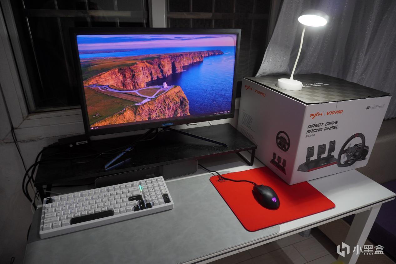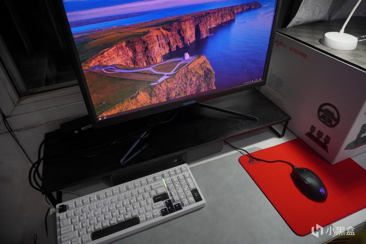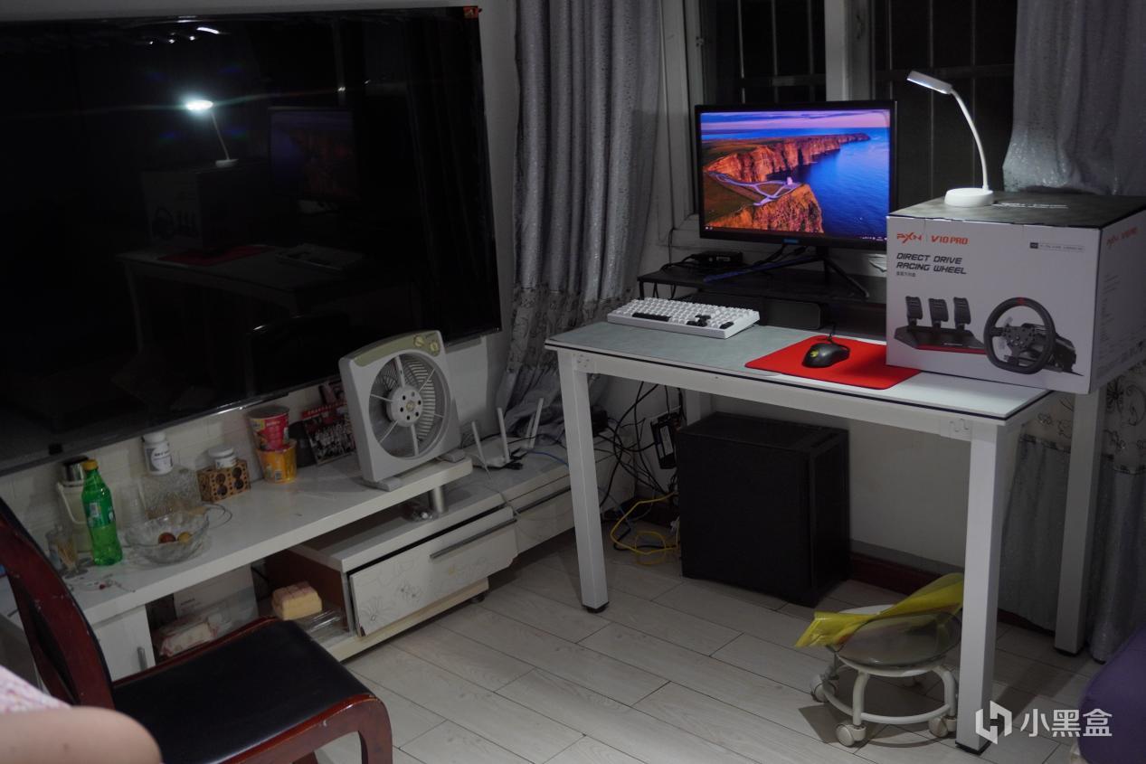 电脑能放的地方还是比较少,空间比较紧促,所以放在客厅了,显示器我用的是比较老的4K显示器,是松人这个品牌,这个是我之前想测试4K分辨率在海鲜市场买的,就是屏幕有点发紫。音响是七彩虹的一款长条音响,听个声就行了。我也没有独立麦克风,就用我用了5年的漫步者G2当麦克风了。键盘是我用了半年的VGN S99,因为没有全配列就用98配列的了,把键帽轴体拆下来整个都洗一遍,看起来像新的一样。鼠标也是我用了半年的乌龟海岸 冰豹魔幻豹夜枭V2 PURE AIR,一款手感比较好的人体工学鼠标,用的特别舒服。垫子是桌垫+鼠标垫的组合,鼠标垫是首席玩家的妖。最右边的是莱仕达的赛车模拟器,型号是V10 PRO。因为之前我妈玩过一次特别有兴趣,就放在这边,她什么时候想玩我就装上去。因为最后一款游戏测的是地平线4,还是可以玩的。