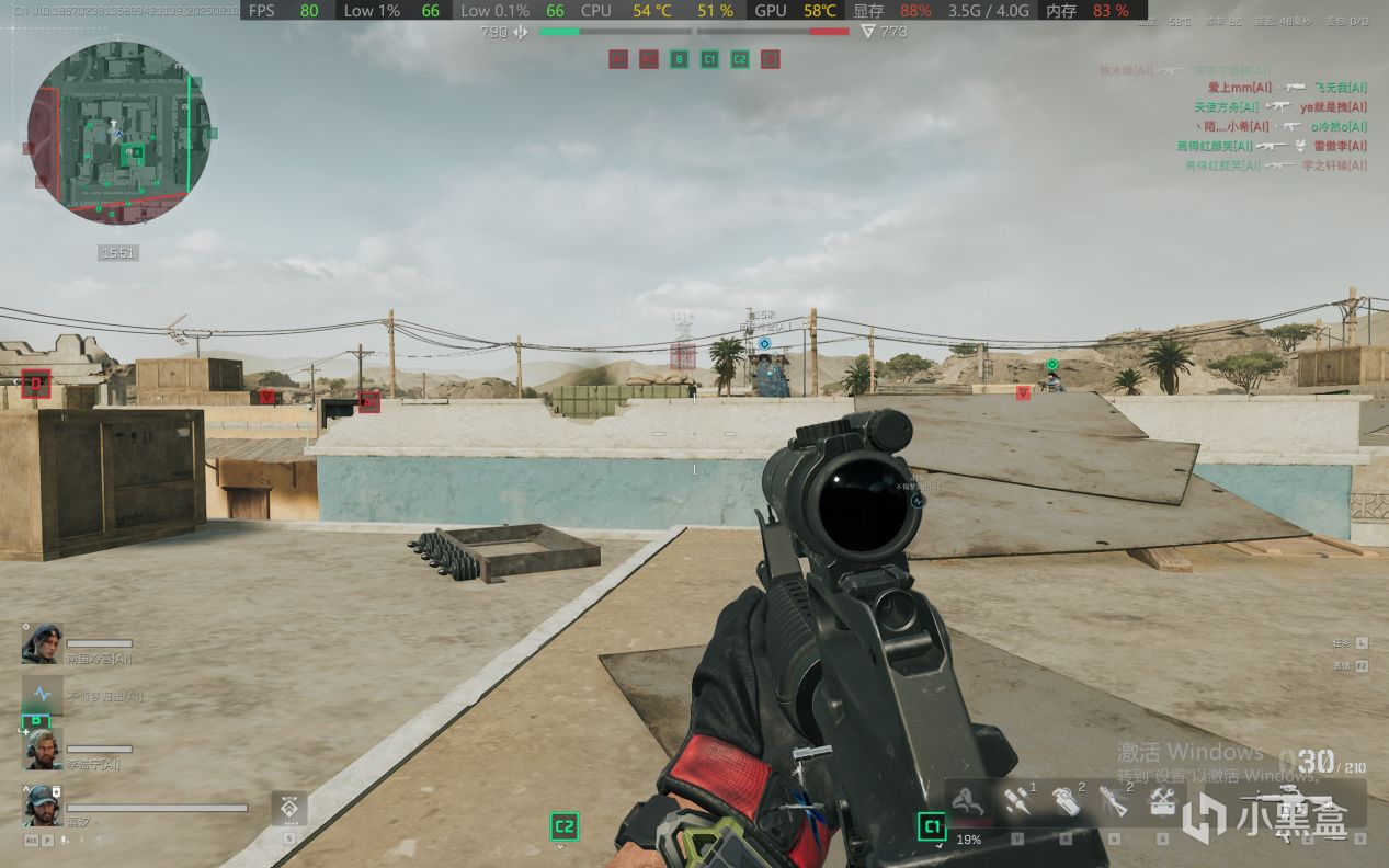 在三角洲行动这款游戏中,1K分辨率下,画质设置:整体低画质,纹理质量:中,后处理质量:高,动画质量:高,场景视距:中,纹理过滤质量:高,开启AMD FidelityFxSuper Resolution 2.0平衡。帧数在70FPS到100FPS浮动。