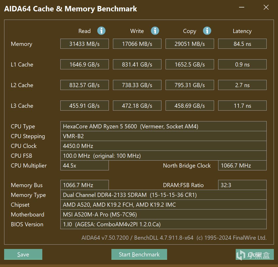 首先内存条在默频2133MHz的情况下,用AIDA64自带的内存条读写速度测试软件进行测试: