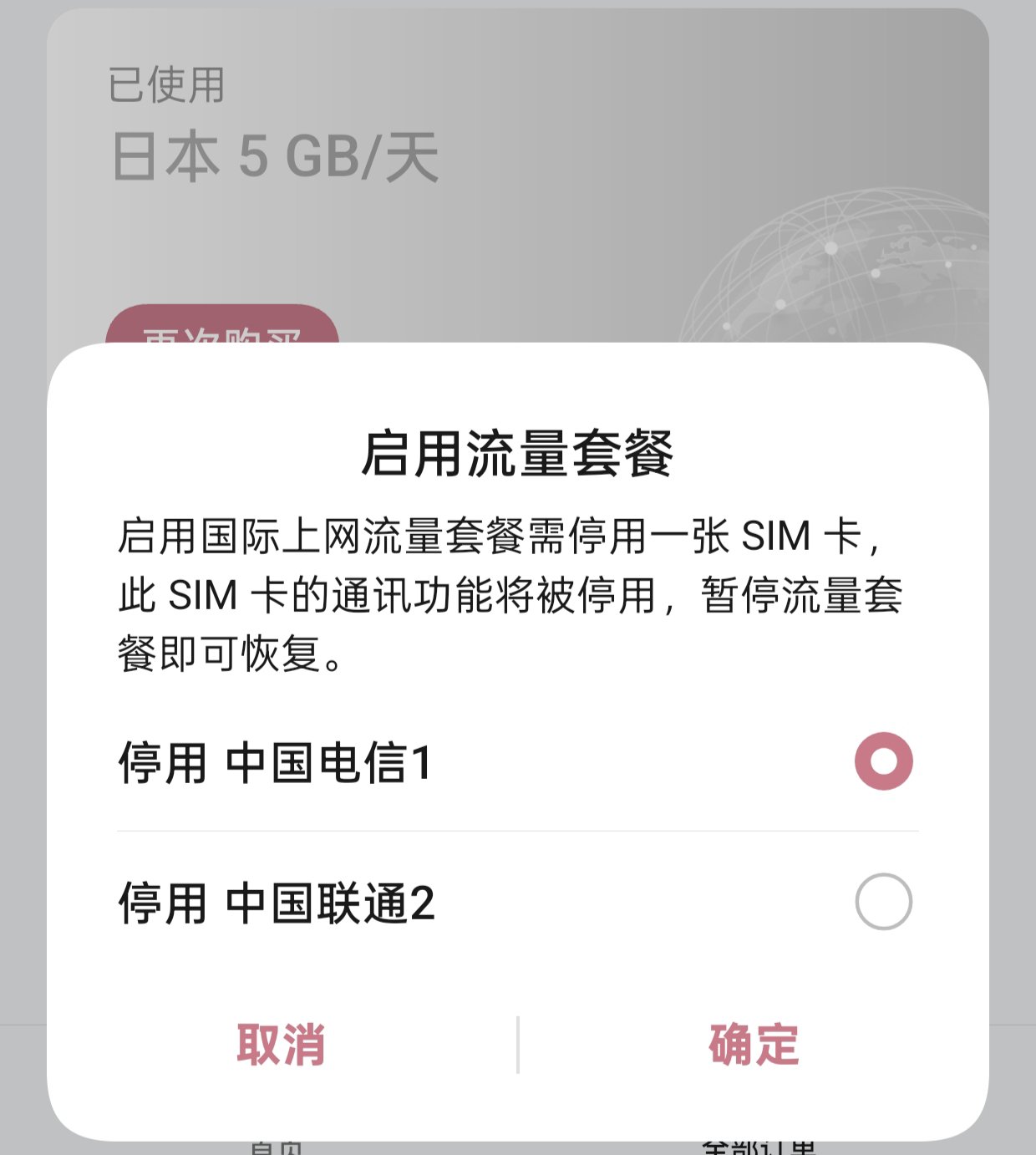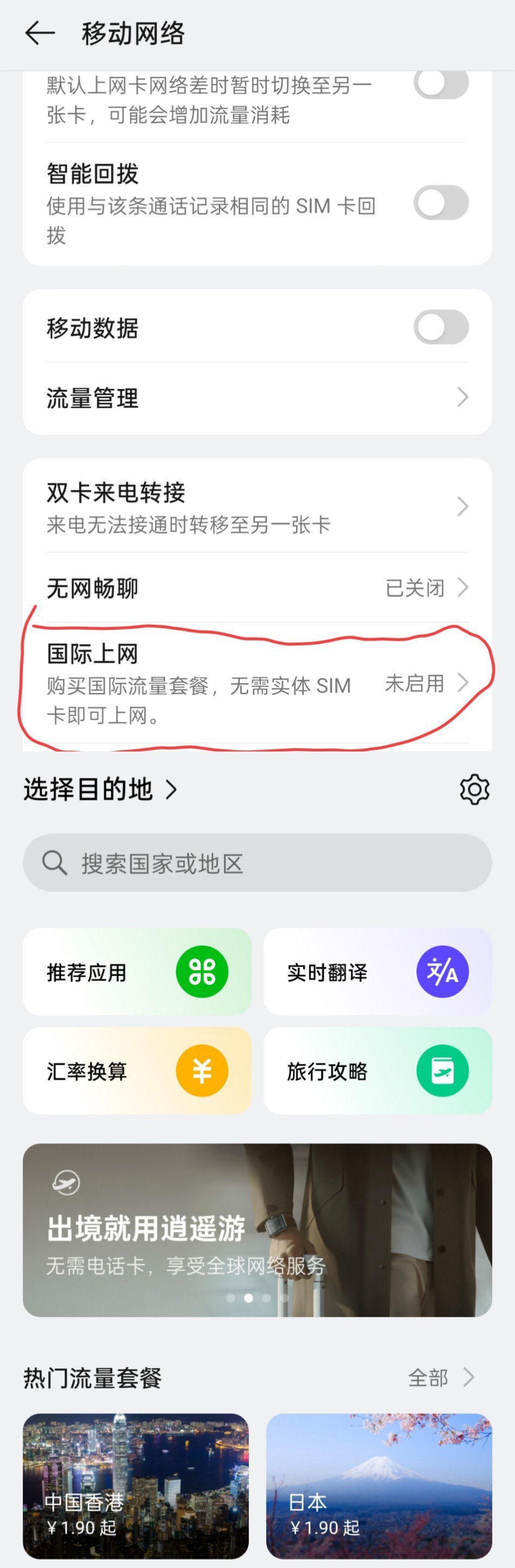 其他渠道:一些牌子的手机里有自带的国际上网功能(如oppo/1+手机里自带的逍遥游,详见图4图5),在这里购买流量包比在官方app里买的便宜,但是还是比实体卡贵,适用于救急或者忘记提前买实体卡的猪鼻(是的就是我本人)这样使用境外流量也会占用一张sim卡的位置,手动禁用另一张卡就行。