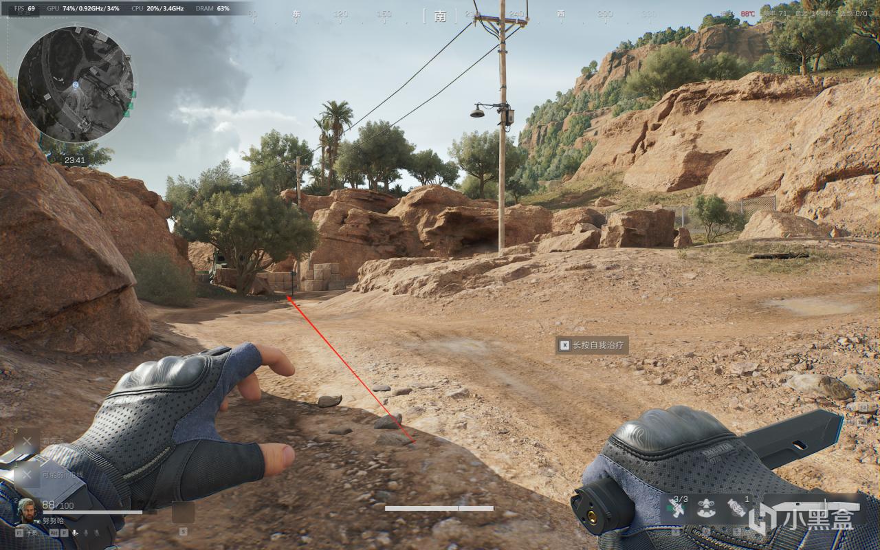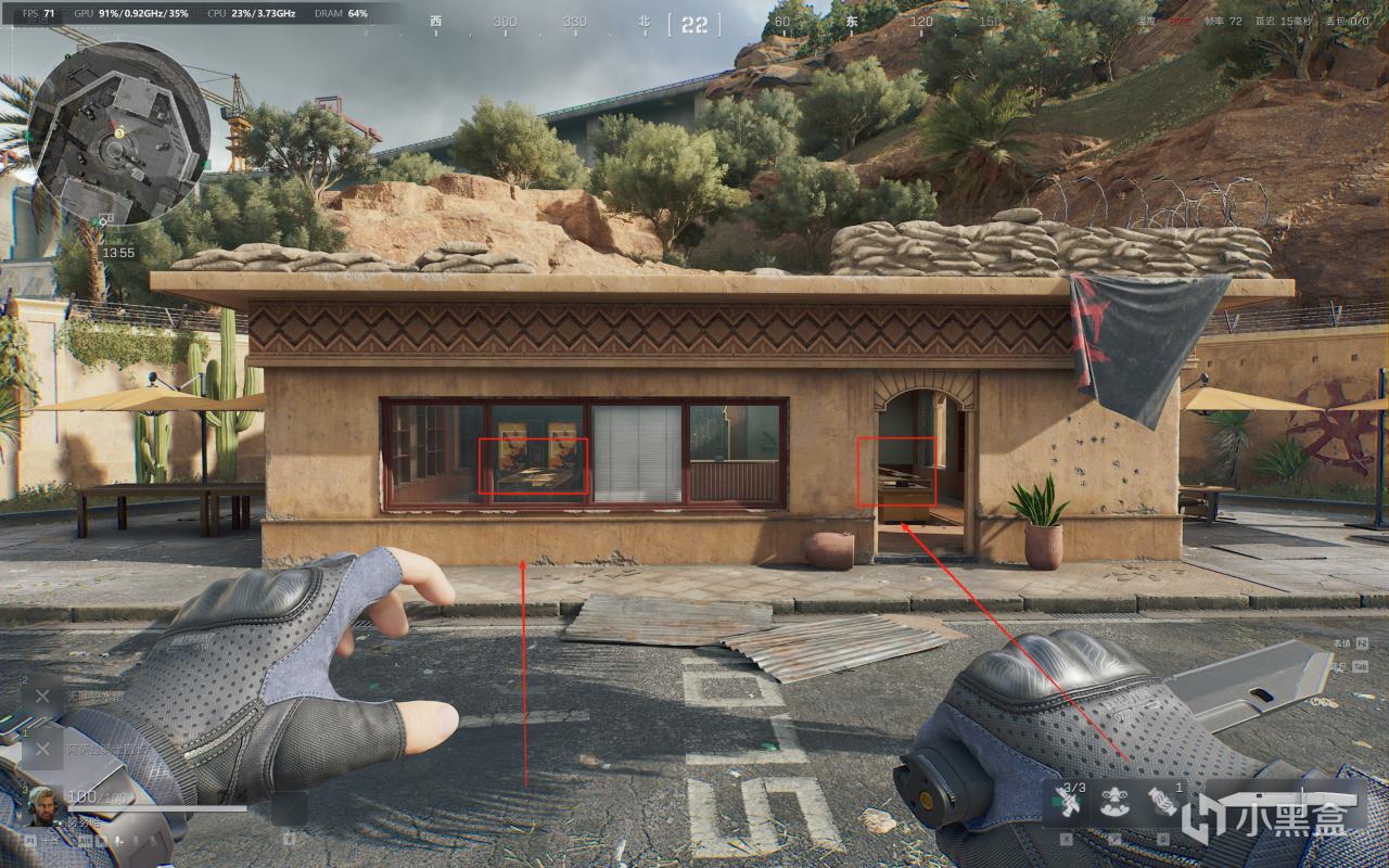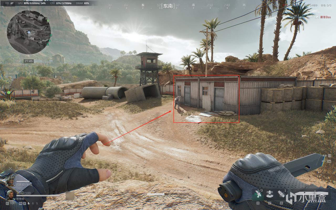 這裏容易蹲人,走到這裏慢慢觀察一下,能看到槍管,不用怕,對方視角有樹擋着,看不到你