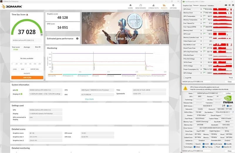 iGame RTX 5090D v2 Vulcan OC 24GB在Time Spy测试中图形得分48128,最高频率2910MHz,核心温度69℃,显存最高温度76度,功耗578W。