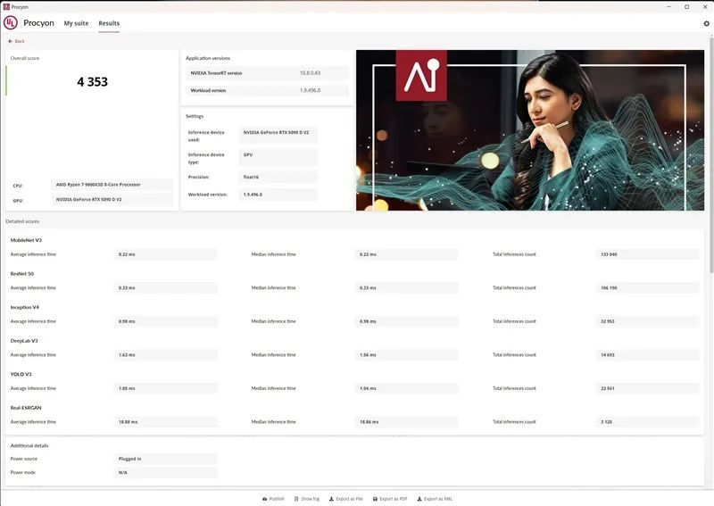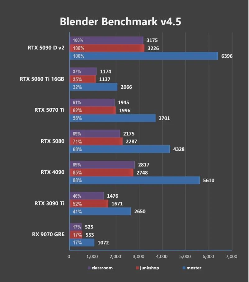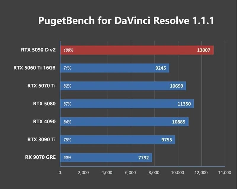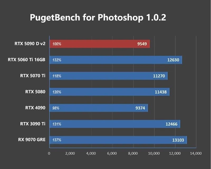 总体来说,RTX 5090 D v2的是生产力性能比起上代的RTX 4090有17%左右的提升,不过有部分软件测试出现异常,IndigoBench无法识别NV显卡,PugetBench for Photoshop跑分偏低,经过多次尝试,确认是驱动的原因。