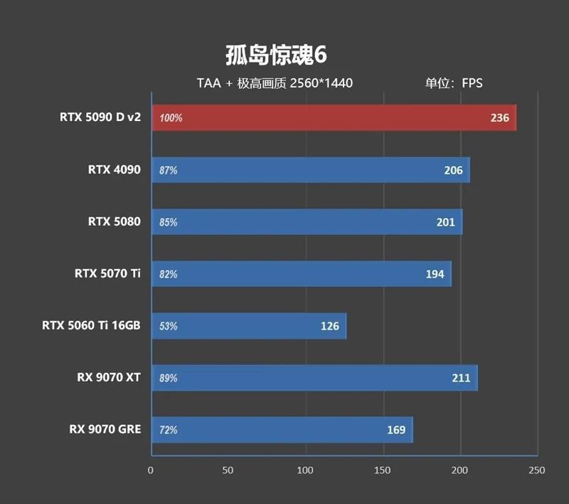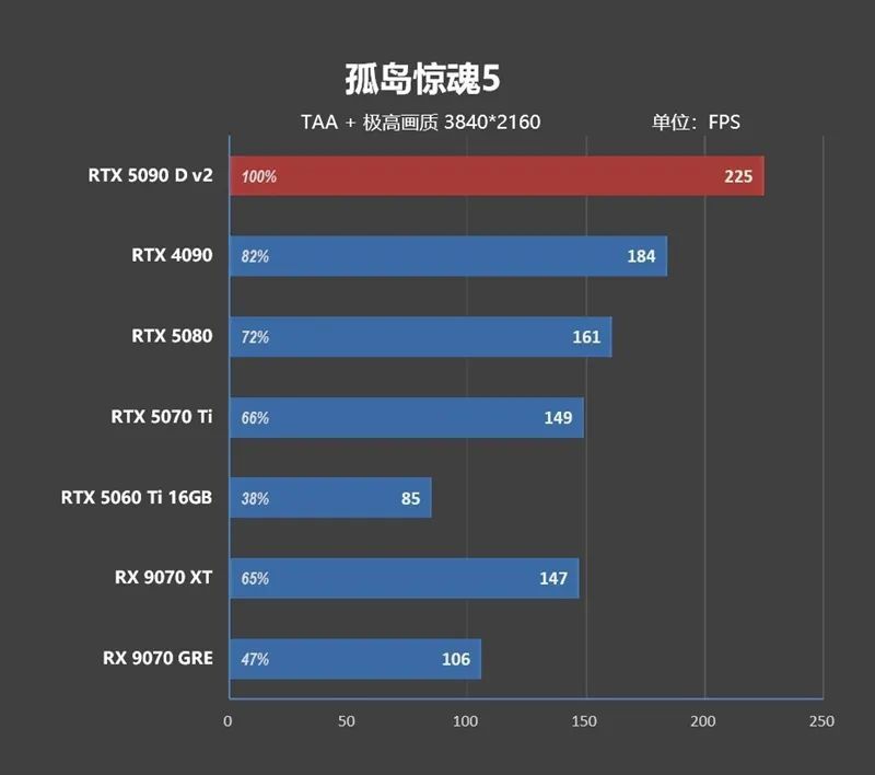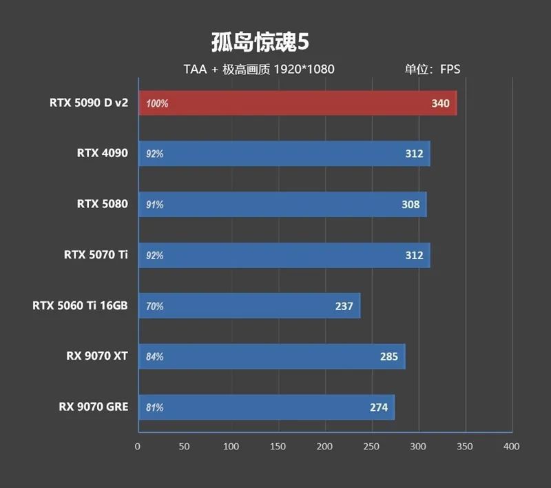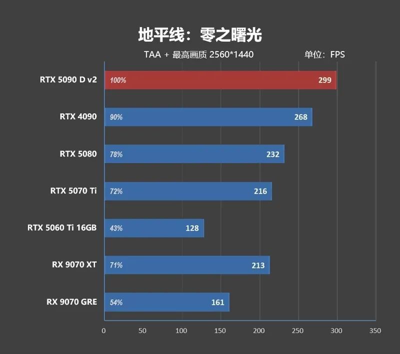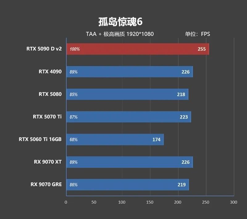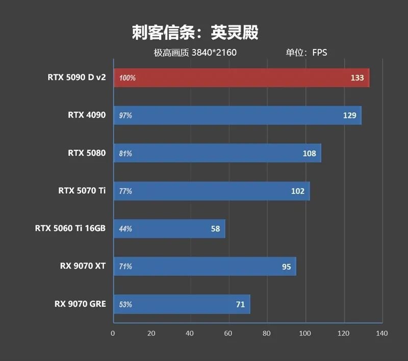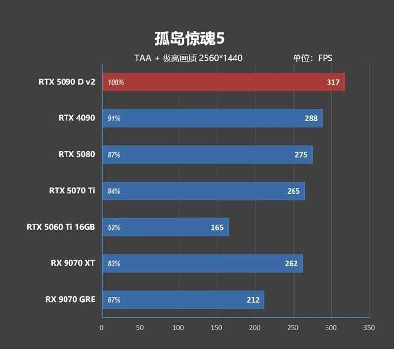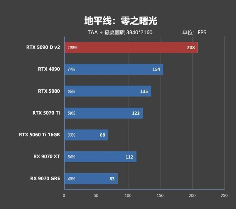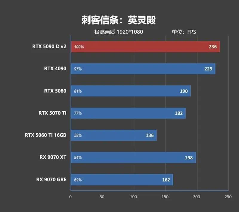 1080P分辨率下 ,由于CPU存在巨大的瓶颈,高端显卡之间完全无法拉开性能差距,RTX 5090 D v2只比RTX 4090快了8.8%,比RTX 5080快了21.7%。