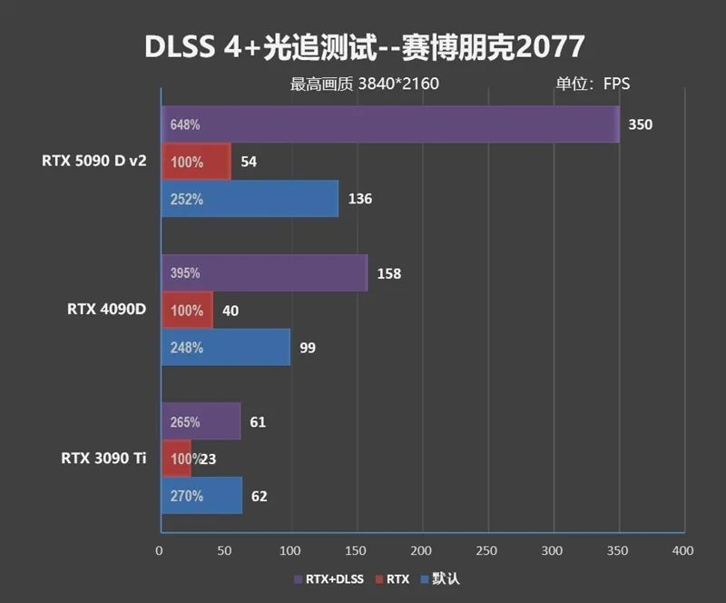 《赛博朋克2077》在4K分辨率下帧率为136FPS,开启光追之后掉到了54FPS,打开DLSS 4之后,帧率为350FPS,提升幅度548%。