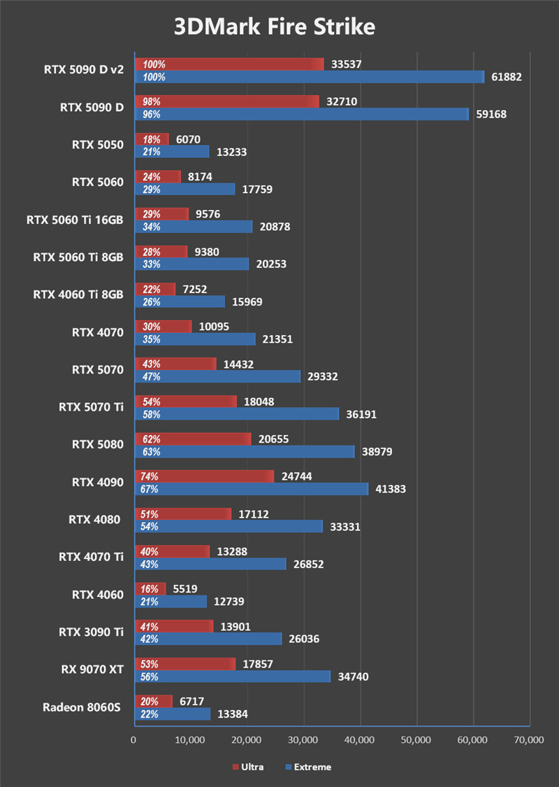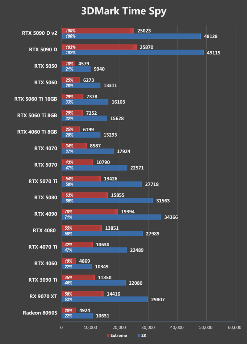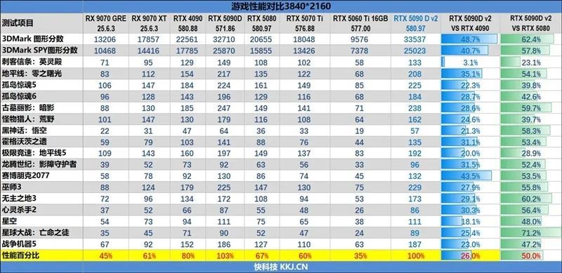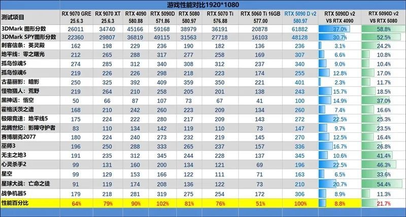 至于RTX 5080,RTX 5090 D v2对其拥有巨大的性能优势,1080P、2K、4K分辨率下分别能领先21%、33%和50%。