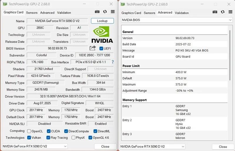 iGame GeForce RTX 5090 D v2 Vulcan OC 24GB GPU-Z截图