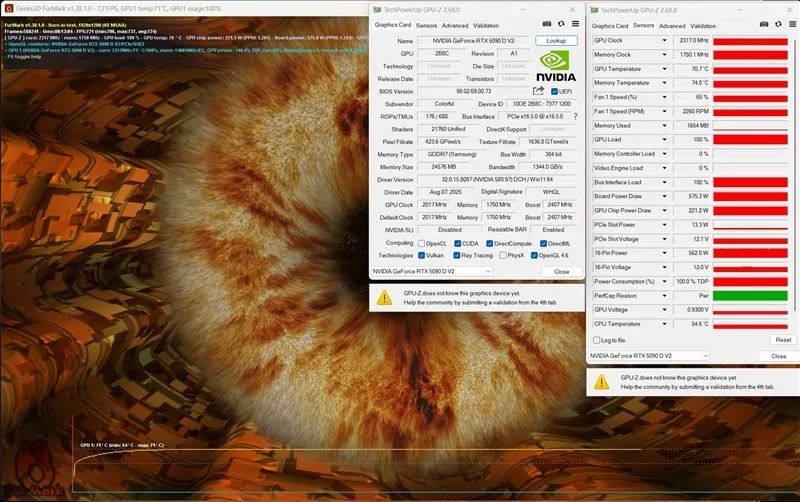 运行12分钟之后,iGame RTX 5090 D v2的温度稳定在70度附近,显卡的功耗575W,烤机时GPU频率为2317MHz,CPU风扇转速2260RPM。