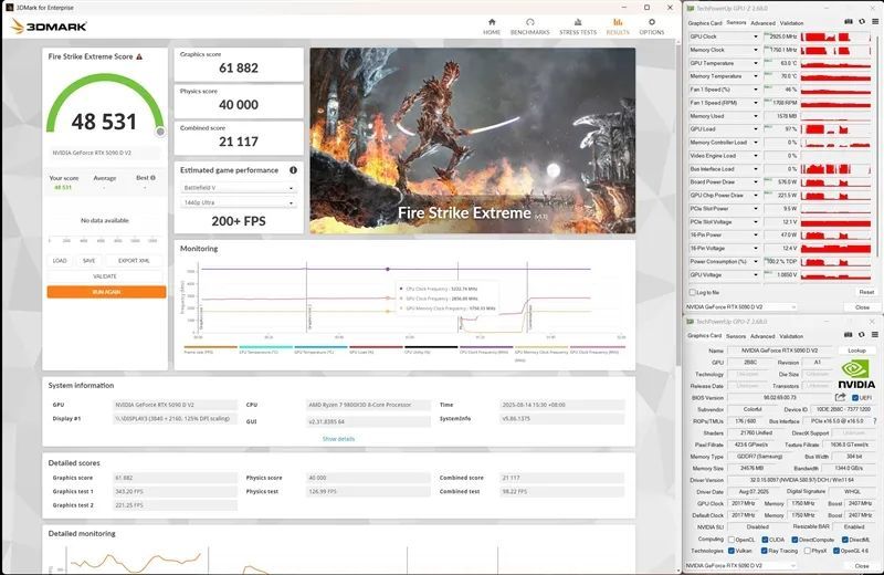 iGame RTX 5090D v2 Vulcan OC 24GB在Fire Strike Extreme测试中图形得分61882,核心频率最高2925MHz,核心温度最高63℃,显存最高温度70℃,最高功耗576W。