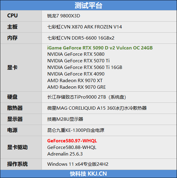测试说明,本次参与对比的7块显卡都使用了新版本驱动程序重新测试了成绩,由于时间有限,RTX 5090 D依旧是首发测试的成绩,数据只做参考,不参与对比。