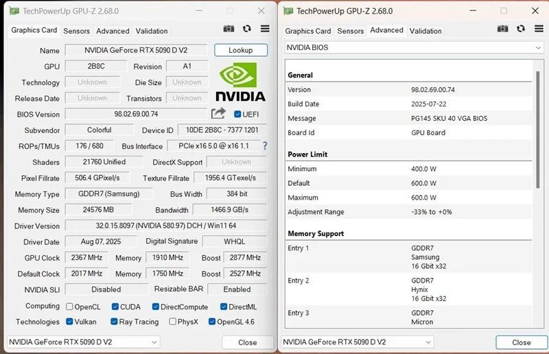 从上表可以看出,除了显存之外,RTX 5090 v2与RTX 5090 D没有任何差别,甚至连价格都一样…..