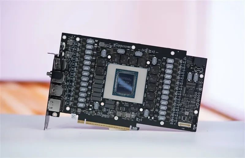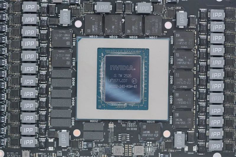 周围是12颗GDDR7显存,单颗容量2GB,速率为28Gbps,总容量24GB、位宽384bit。