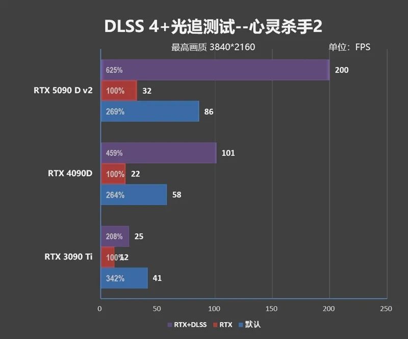 我们测试了6款游戏,在开启DLSS 2(不开插帧)时,RTX 5090 D v2的平均提升幅度为119%,RTX 4090D和RTX 3090 Ti则有134%左右。