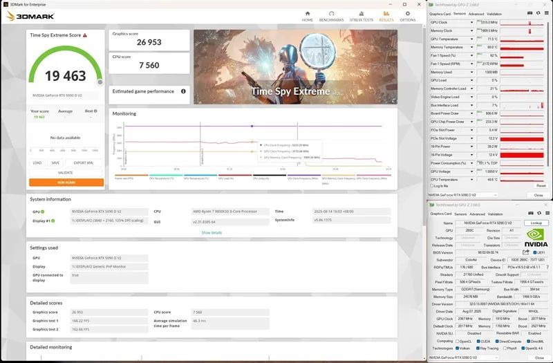超频之后的七彩虹iGame RTX 5090D v2 Vulcan OC 24GB在 3DMark Time Spy Extreme中的图形分数从默认的25023增加到了26593,增长了1670分,提升幅度约为8%,最高运行频率3315MHz,稳定频率也有3170MHz。