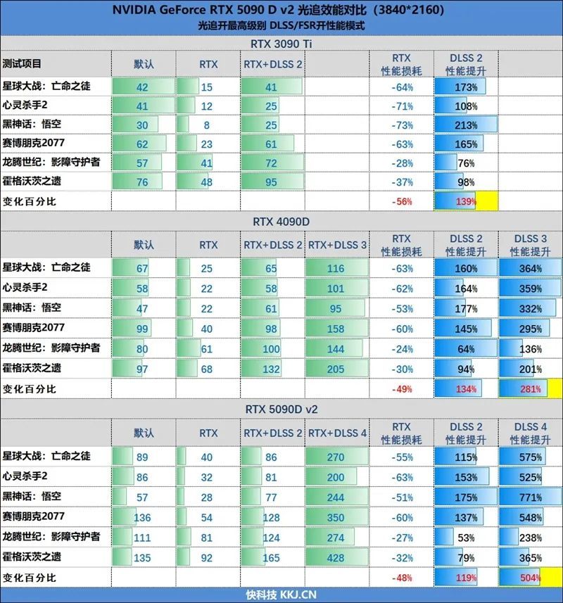 在开启DLSS 4之后,综合6款游戏的测试数据,RTX 5090 D v2平均下来504%的性能提升。