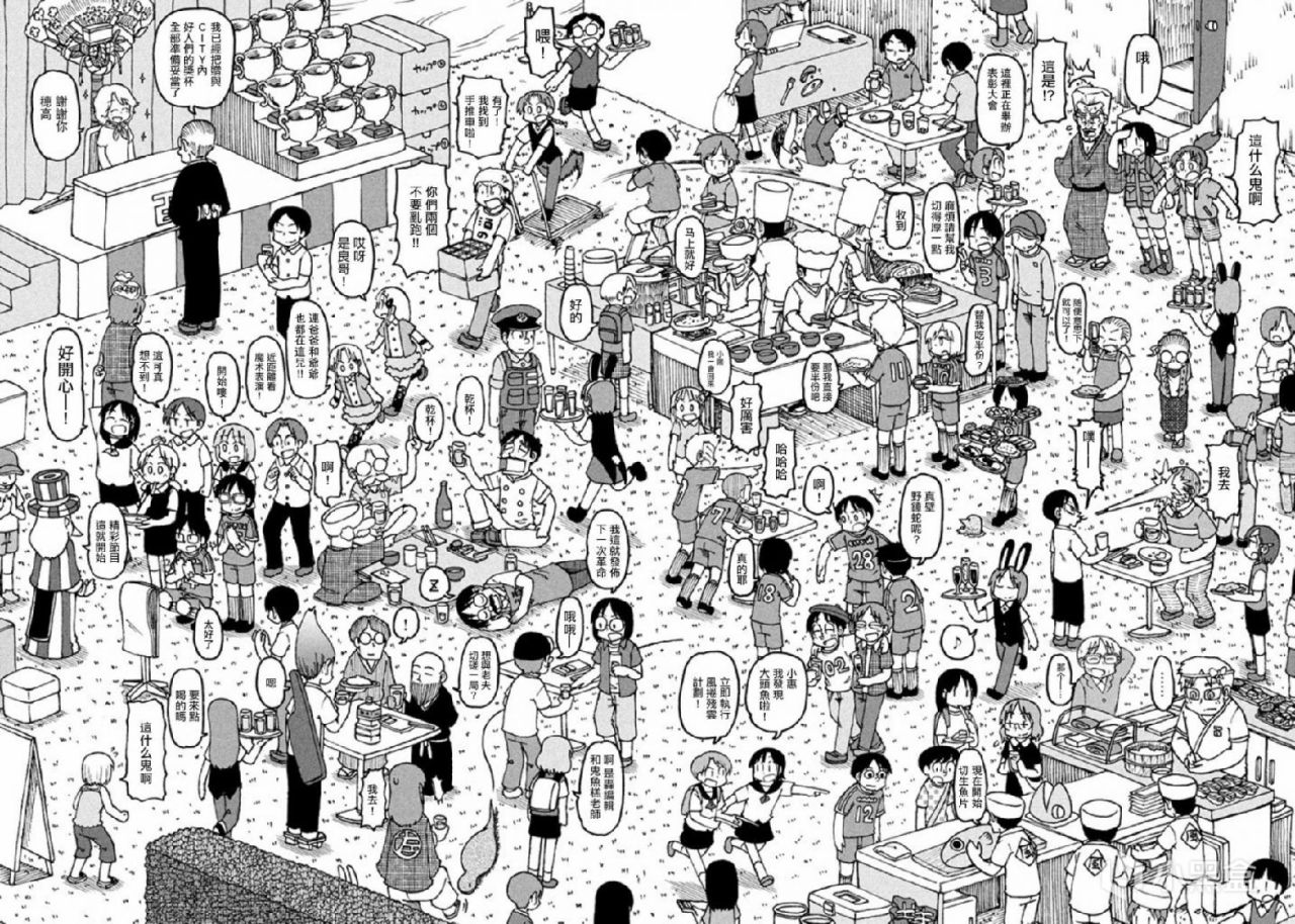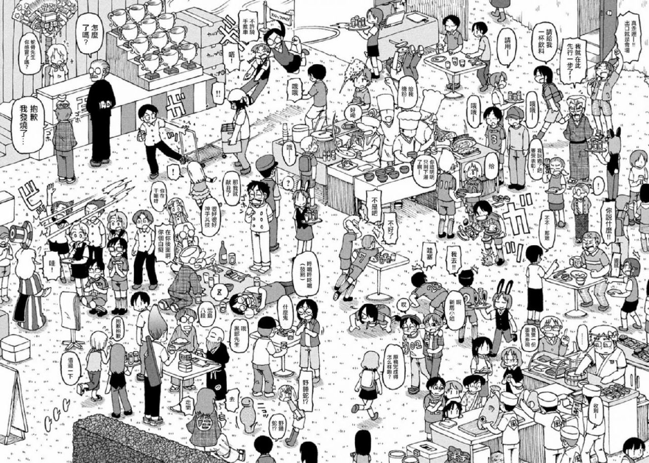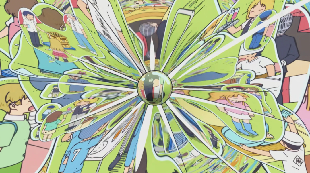 事件末尾,所有人汇聚在一起,原作用四个巨大的跨页去描绘每个人不同的行为。而京都动画选择将不同事件的人拆分,相连,让观众能注意到小城居民参与的每个事件……