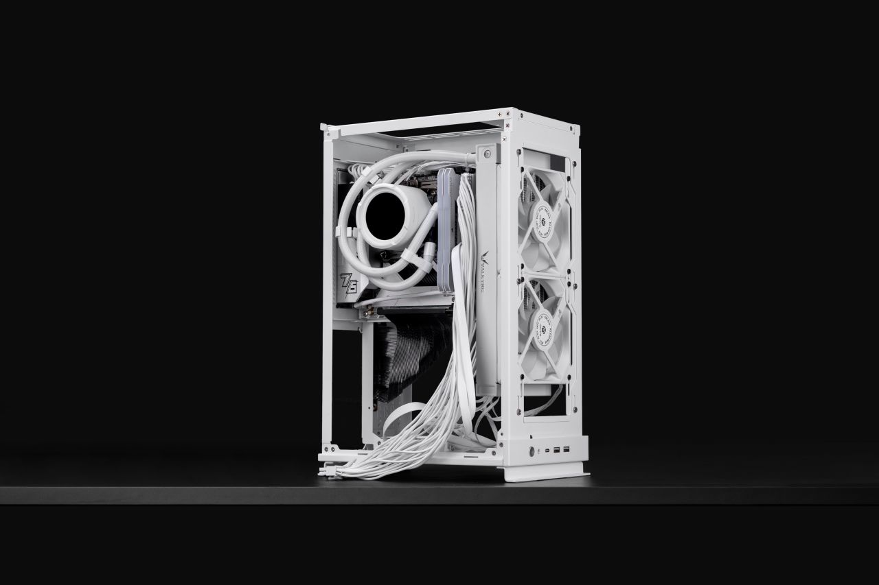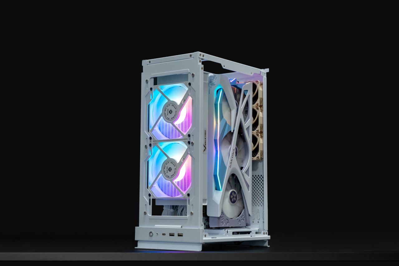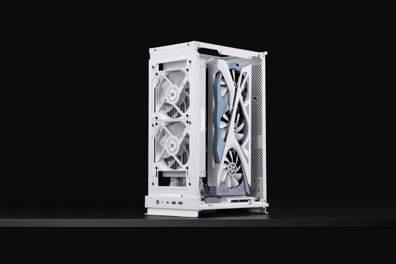 本套显卡选用了同样颜值非常高的9070XT盈通花嫁,这款显卡最大的精髓就是要竖装才能完美展示它的颜值,因此搭配立式机箱非常的合适