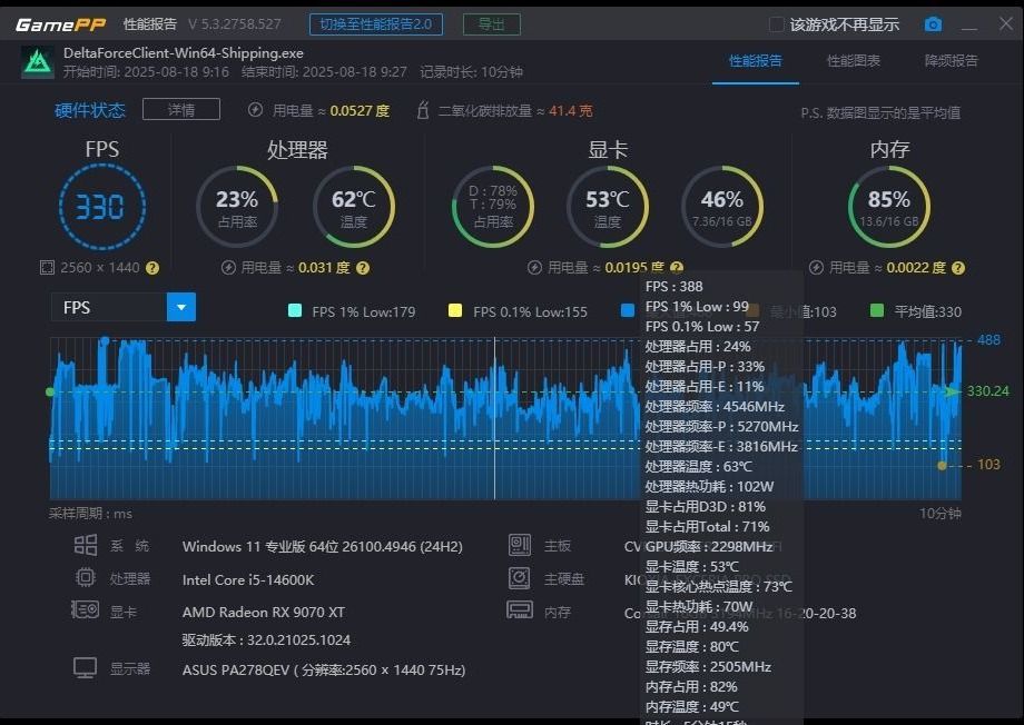 三角洲行动,性能模式,中画质,平均帧率330,CPU温度在62度左右,显卡温度在53度左右