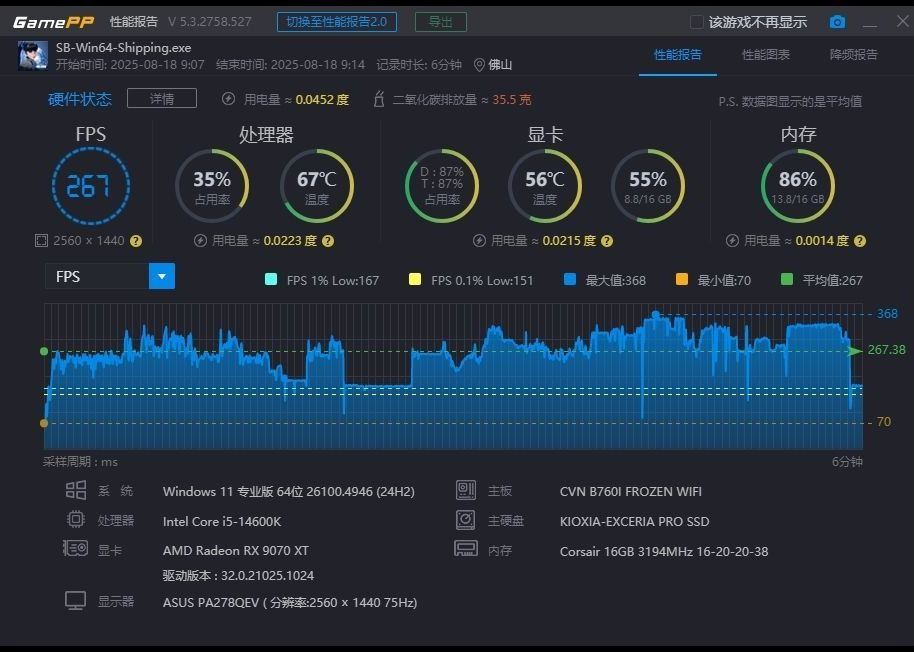 近期新游剑星,最高画质,开启三倍帧生成,平均帧率267,CPU温度在67度左右,显卡温度在56度左右
