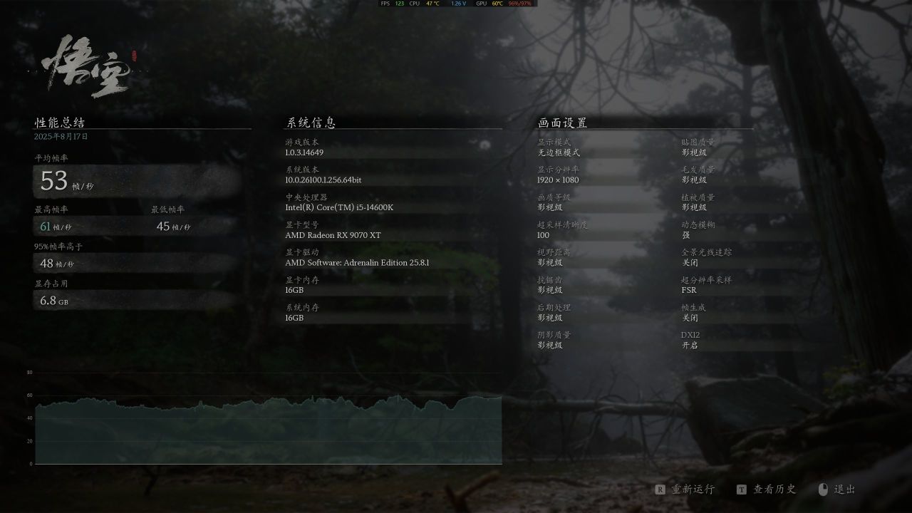 黑神话悟空,影视级画质以及关闭帧生成和光追,平均帧率53FPS