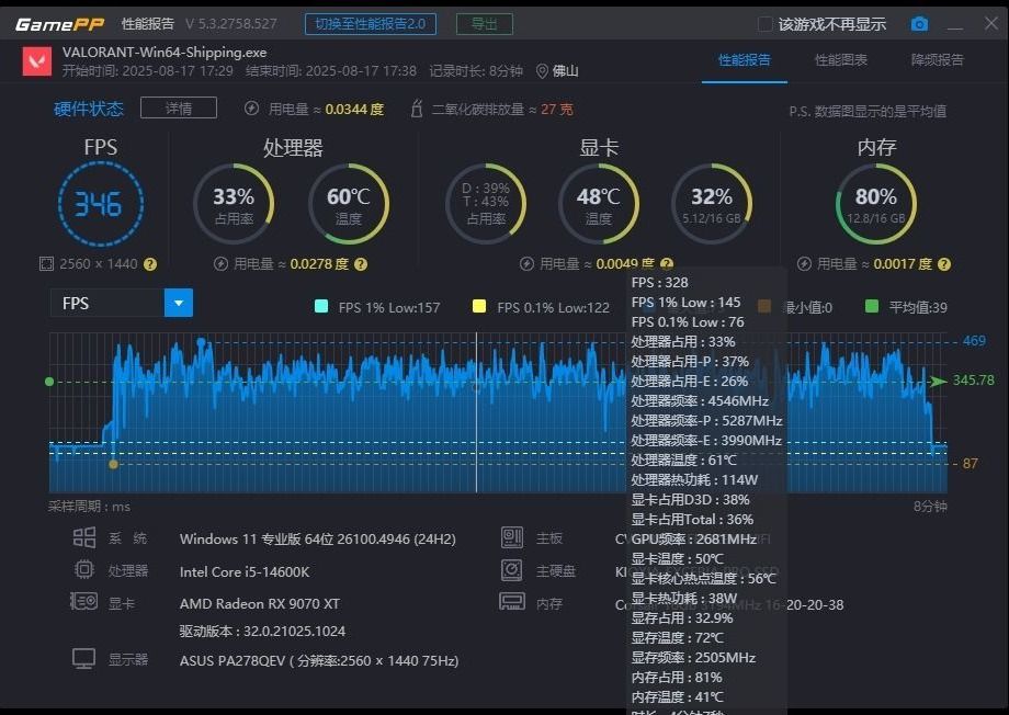 无畏契约,最高画质,平均帧率346,CPU温度在60度左右,显卡温度在48度左右