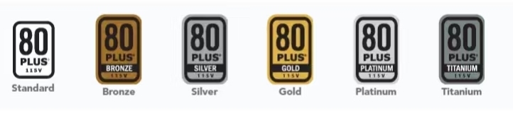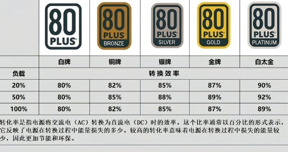 80Plus認證是國際通用的轉換效率標準,等級從低到高分爲白牌、銅牌、銀牌、金牌、白金、鈦金,等級越高,轉換效率越優。