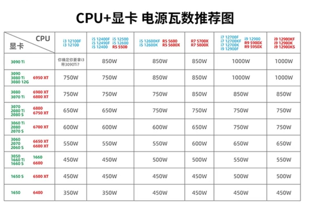選多大功率呢家人們?得看CPU和顯卡的總功耗。基本上也就這兩個是比較耗功率的,這裏大家可以自行查詢顯卡和CPU的功率大小。其他的其實也不需要忽略不計。稍微算個十幾瓦。最後再給自己的電源留下一個冗餘瓦數。