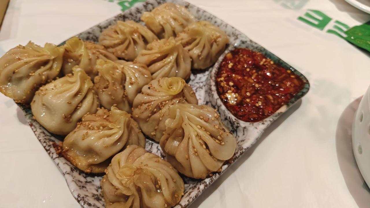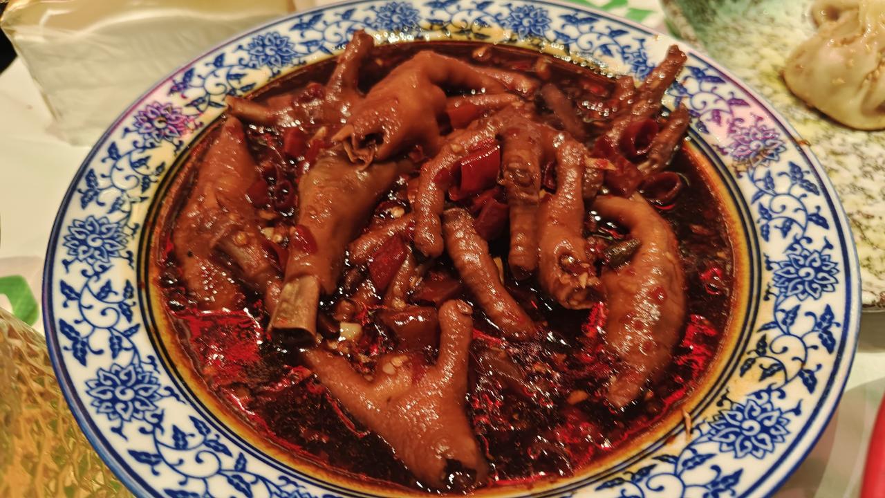 非常软糯,一抿就脱骨。但它是这顿最辣的一道菜,初尝之时,我大意了没有闪,我吃辣糕手终于是败了,四处寻求凉水重置口腔温度。也是因为它我们才知道门外是有冰茶的。后来都是小心翼翼地品尝,并再次诞生新的MVP,那就是蘸鸡爪汤的生煎包。