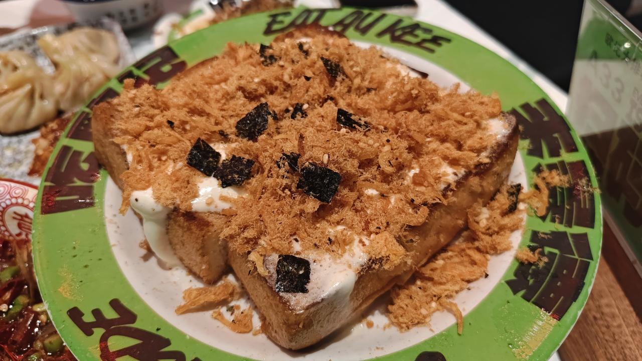 原本很疑惑区区一个吐司怎么这么多人推荐,吃完之后不得不说,在众多辣菜中加入一个甜品是多么明智的选择。肉松是脆的,面包是软的,酱是旺仔味的(但小袁说吃不出来旺仔味),要不是有损形象,我肯定把盘子舔干净。