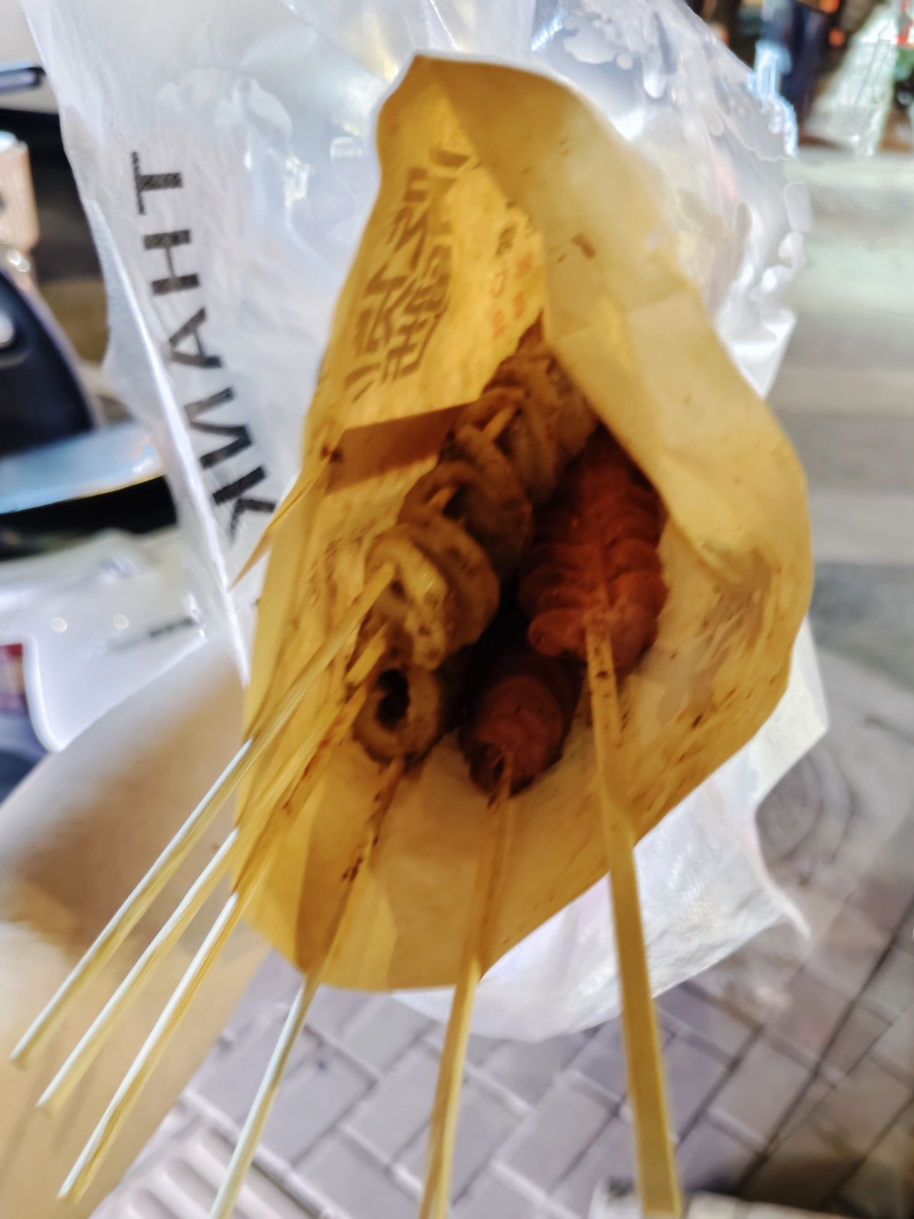 天公作美,吃完饭刚好雨停,马上回去找鸡腿大叔。大叔果然坚守岗位没走,看到我俩还美滋滋地说自己烤的味不错吧😋😋。于是又买了两个烤鸭腿。