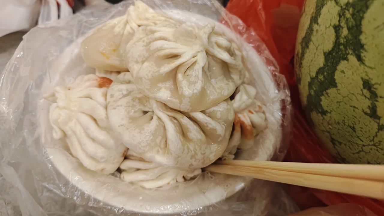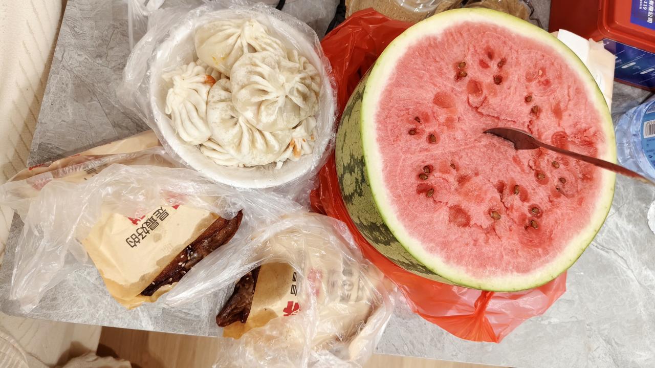 西瓜吃了一大半把我们两个人肚子都给搞大了,汤包只吃完了鲜肉馅的,另外两个口味吃一口就会哈气。哈基包你这家伙,真的可以把我辣死。
