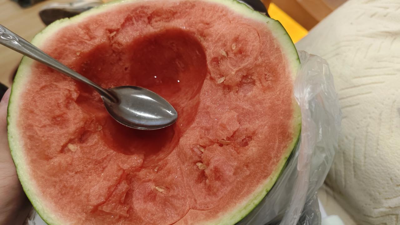 回去的路上看到卖西瓜的摊位,什么?夺勺?九毛九一斤?那我昨天买的四块一斤算什么。