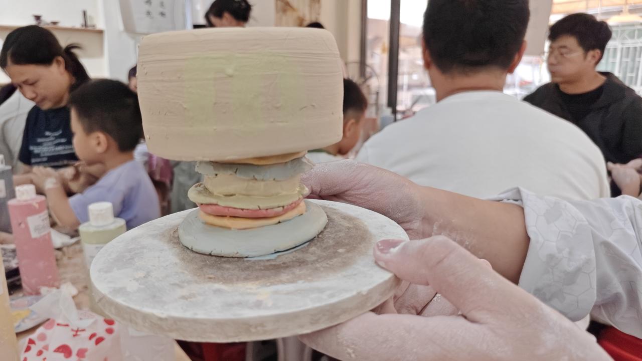 俗话说饱暖思淫欲,又热又撑的接下来去整点手艺活,找了家陶瓷DIY,被塞了两块大泥巴,有样学样的开始乱搞。可惜的是玩那个泥巴转盘的时间太短,而且基本上都是店员在操作。