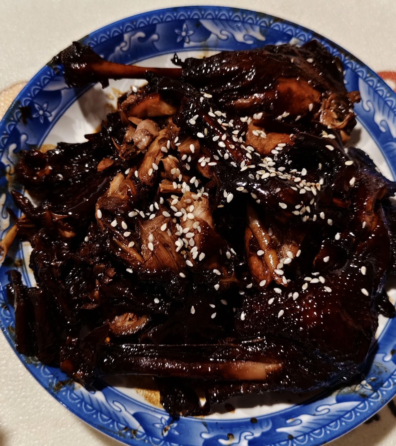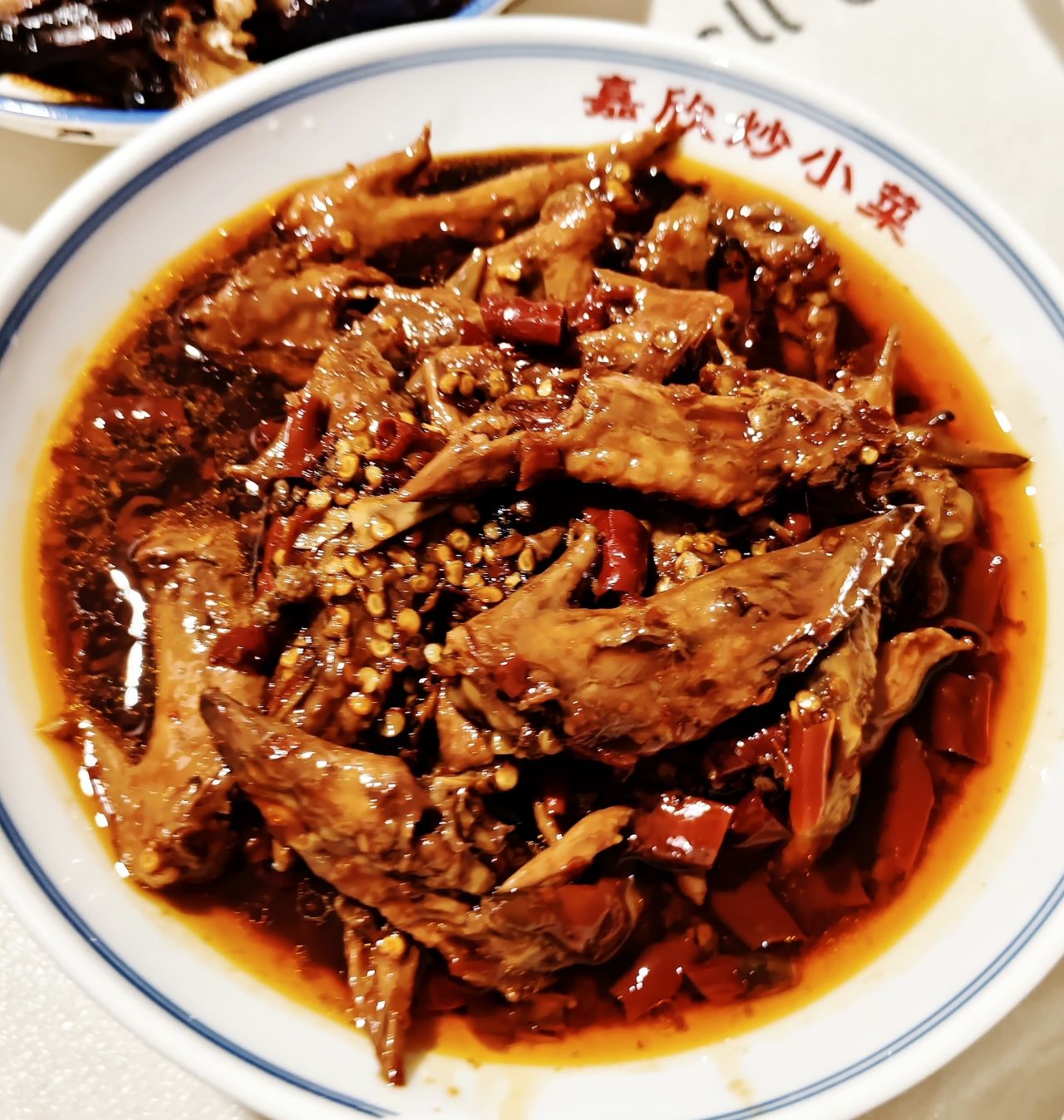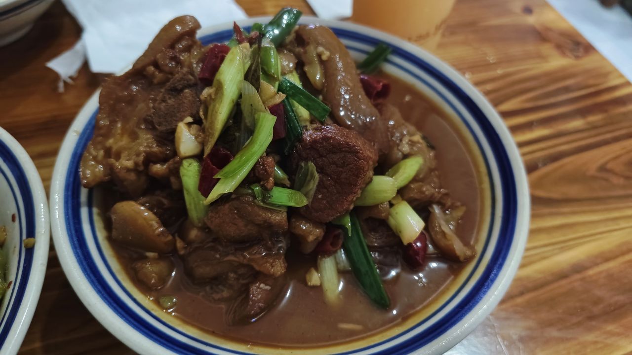 黢黑黢黑的烤鸭,咸甜口的,空口吃有点太咸,下饭很香,看起来没一点辣椒,实际比前一天在小乐川吃的三个菜都要辣。吃一半实在实在有点太辣了,去对面整了两杯柠檬水。