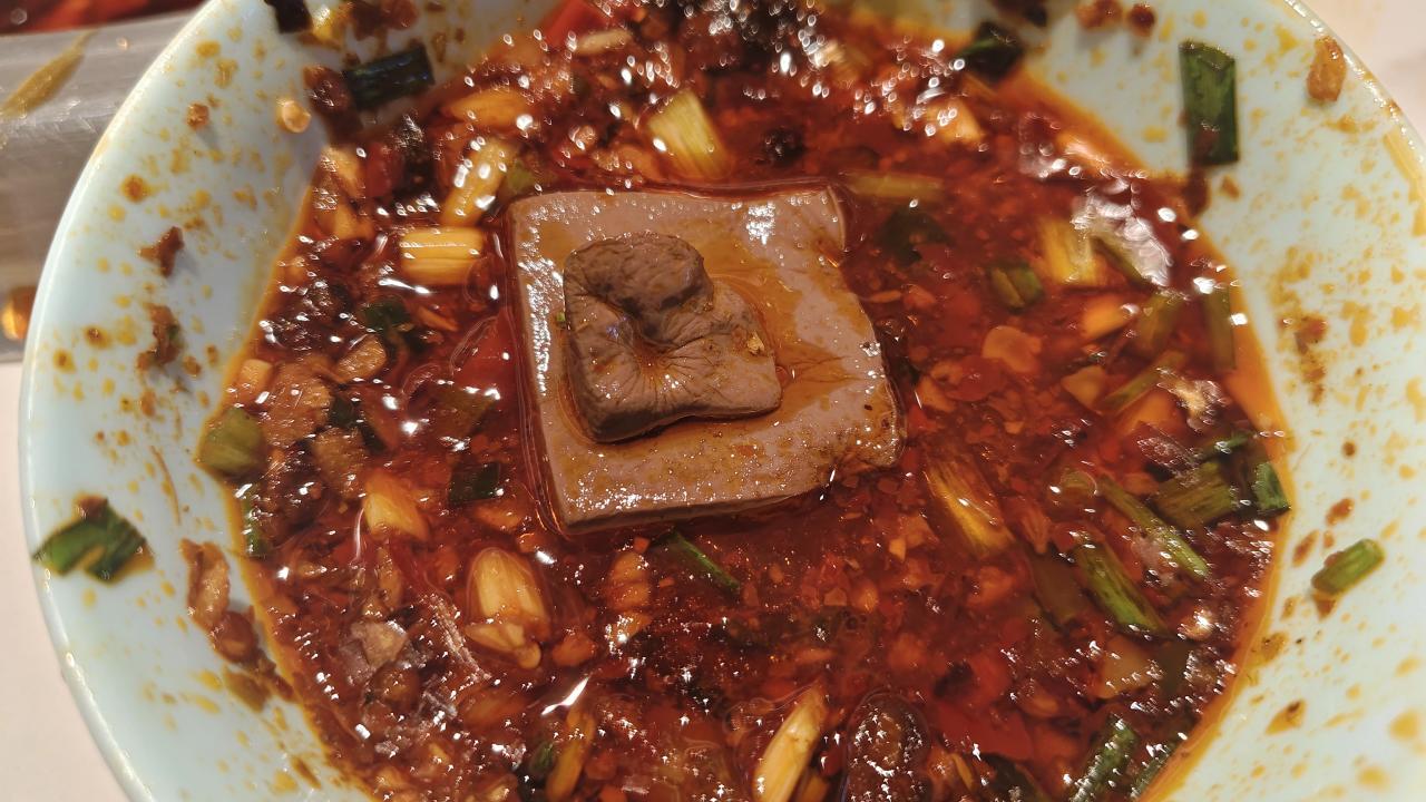 鸭杂。这就非常下饭了,比腰花味更足,乍一看全是辣椒,鸭杂寥寥无几,实际这一碗的肉量很多。小袁吃着吃着喊了两句“味真足”。