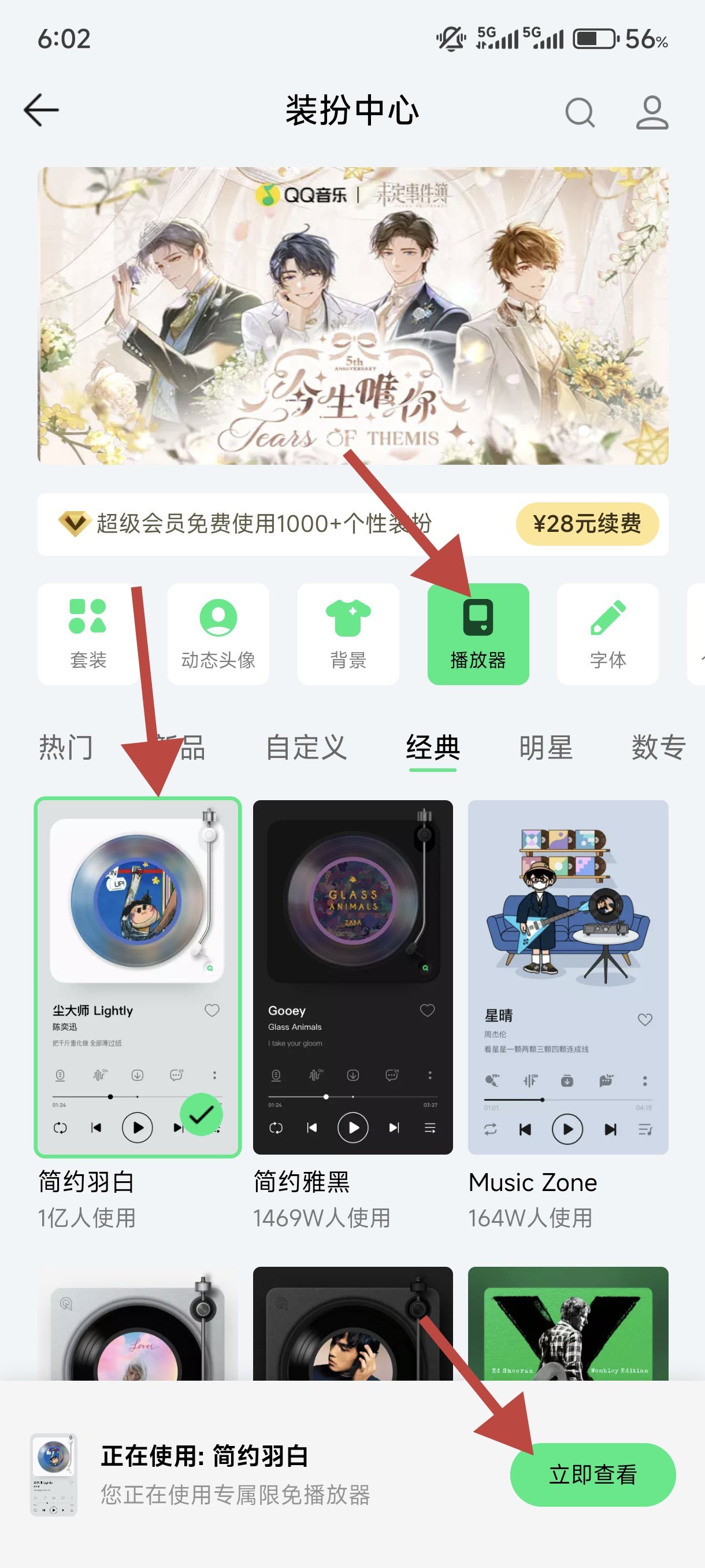 第2步先點擊播放器→經典→選擇簡約羽白→立即查看。
