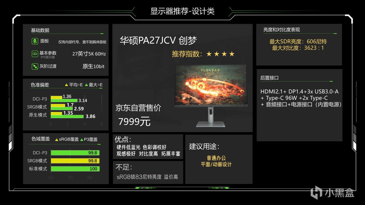 也可以叫PA27JCV,这是一台非常贵的设计屏幕,卖7999元,这台显示器我上次评测的时候也没有看到具体面板,这是一台27英寸5K显示器,5120x2880的分辨率,这台显示器有IPS显示器里逆天的3600:1的静态对比度,SDR亮度606尼特也算是SDR极限了,色域覆盖几乎是拉满的,不过AdobeRGB色域的绿色显示还是不够多,实际上手体验我觉得它画质相当好,甚至给我一种接近OLED的感觉,但同样的它有一个锁83尼特的sRGB模式,也一样的内置了一个可调亮度的REC709模式,可以给需要高亮度的非广色域用户使用,7999元的价格还是挺肉疼的