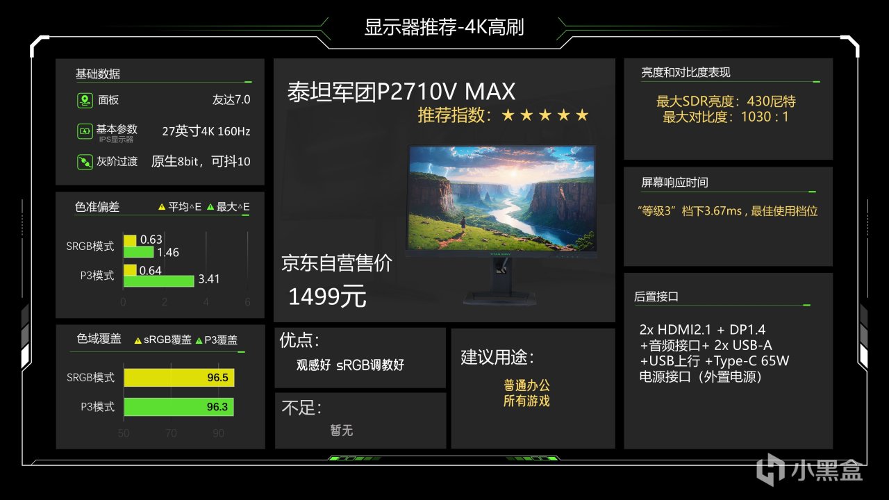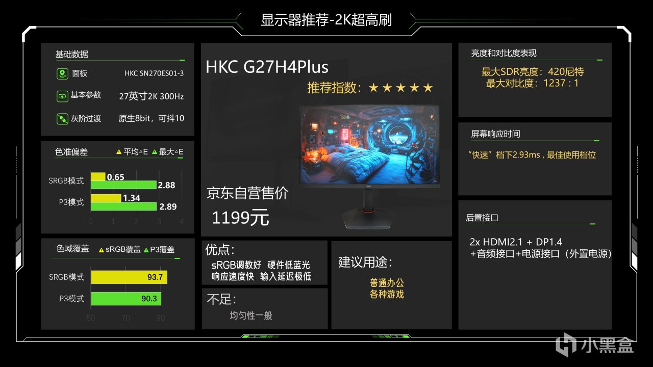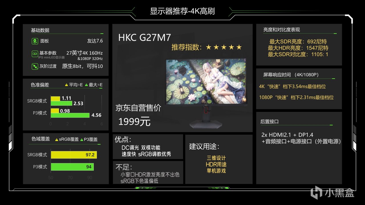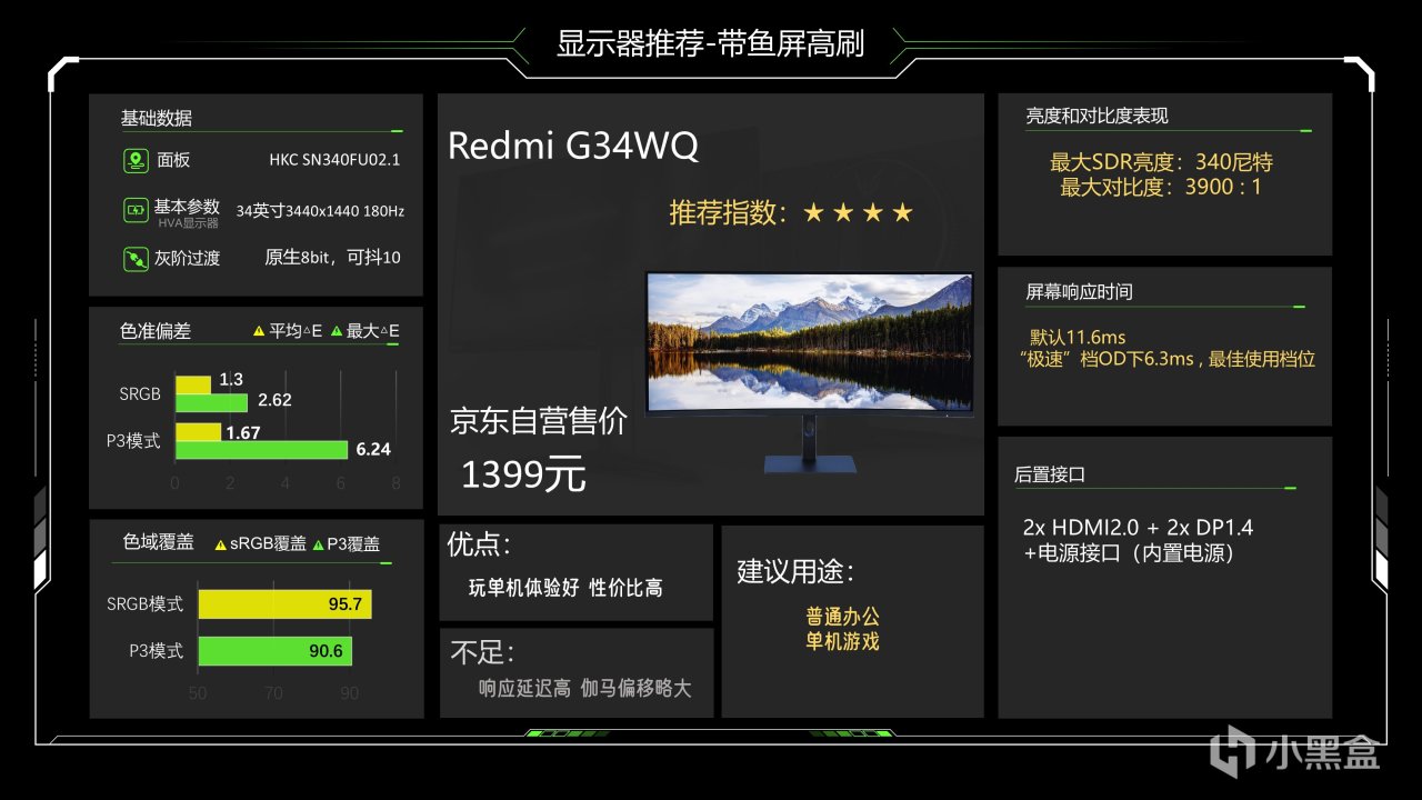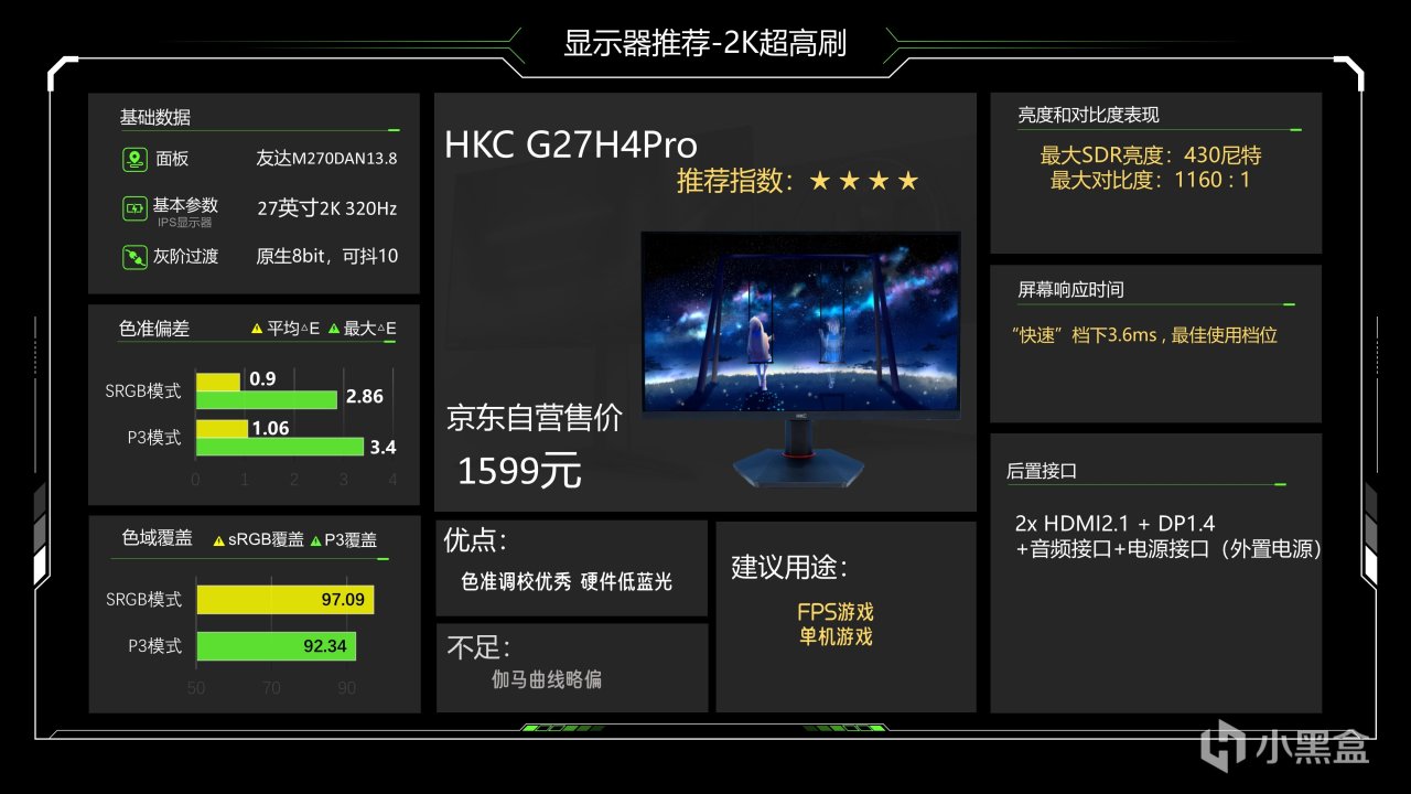 价格1299元,这个价格已经很久没动了估计是快降到底了,仔细看整体调教也还可以,最大SDR亮度可以达到335尼特了,对比度能略超1000:1的IPS典型值,色准数据还好,能满足游戏和看电影需求,相对来说它在P3下6200K级别的色温成了最大的缺点,会造成屏幕偏黄,当然这也看大家长期以来用的是什么色温的灯光,如果你用暖光灯较多的话影响就不大,它的背光肯定是不好的,当然它还有另一个缺点就是品控不太好,便宜又高效,那品控肯定就需要抽奖了