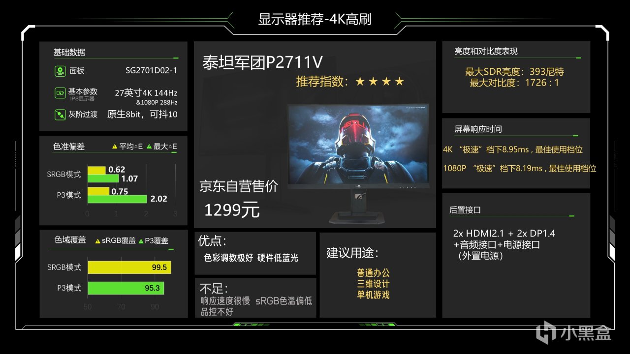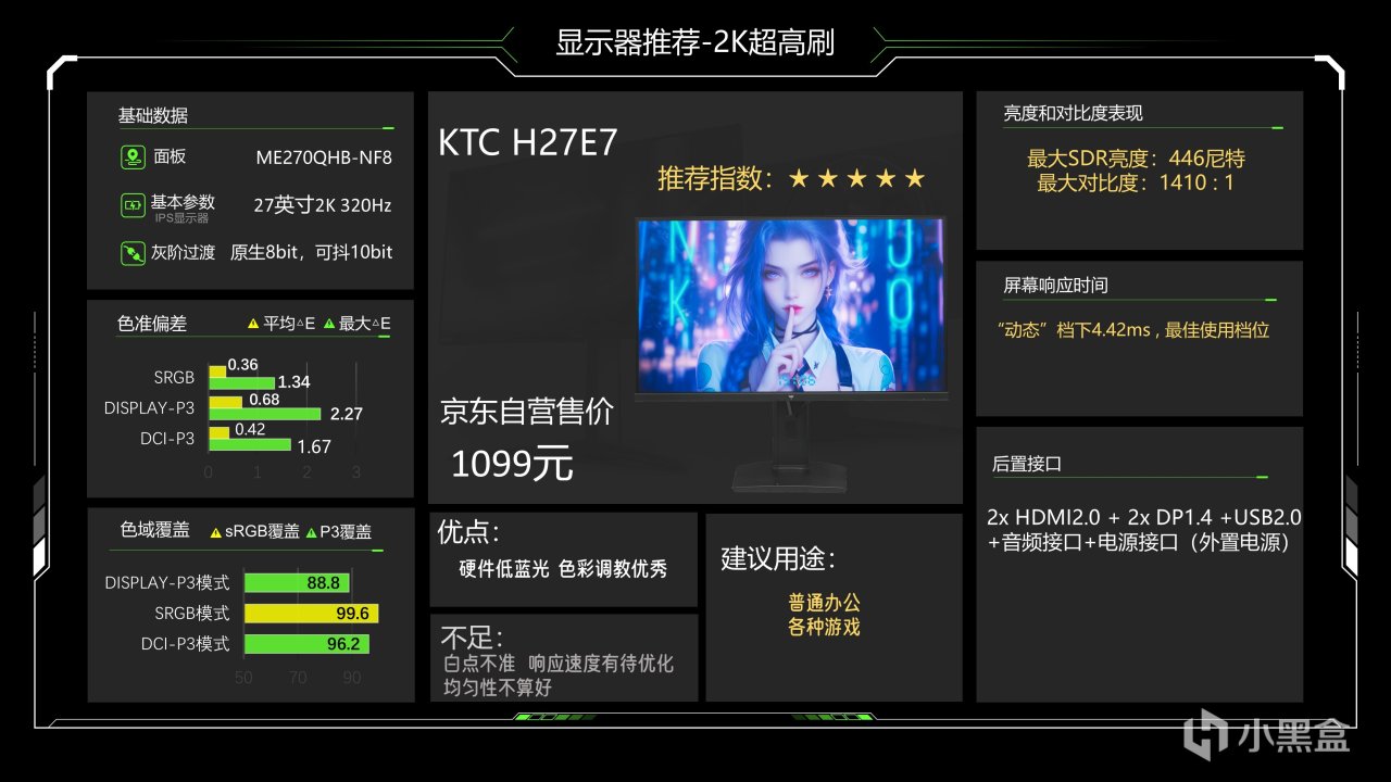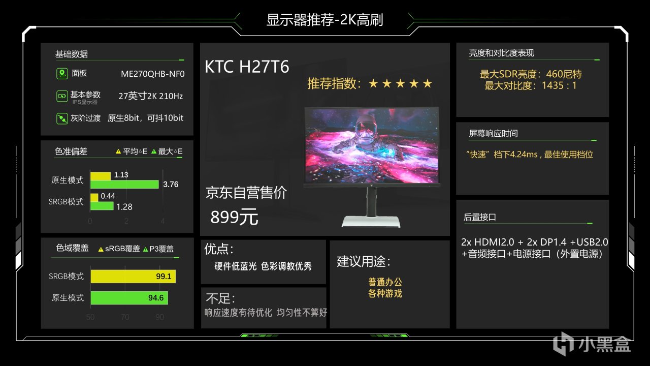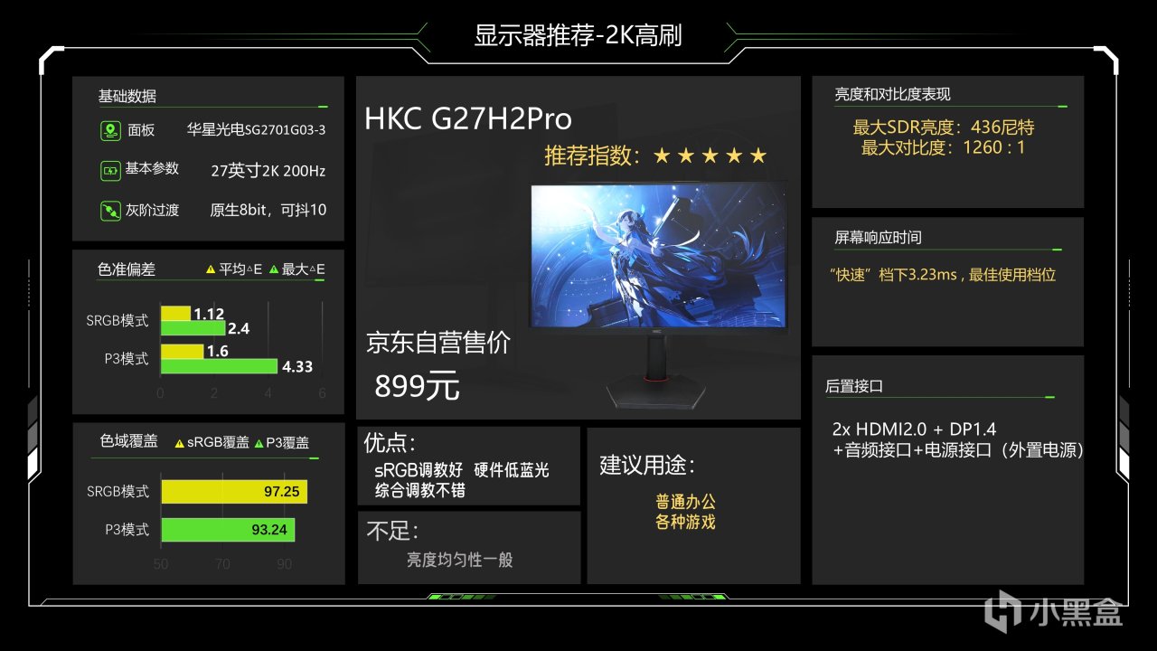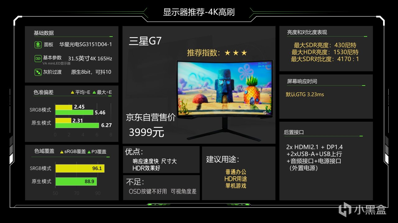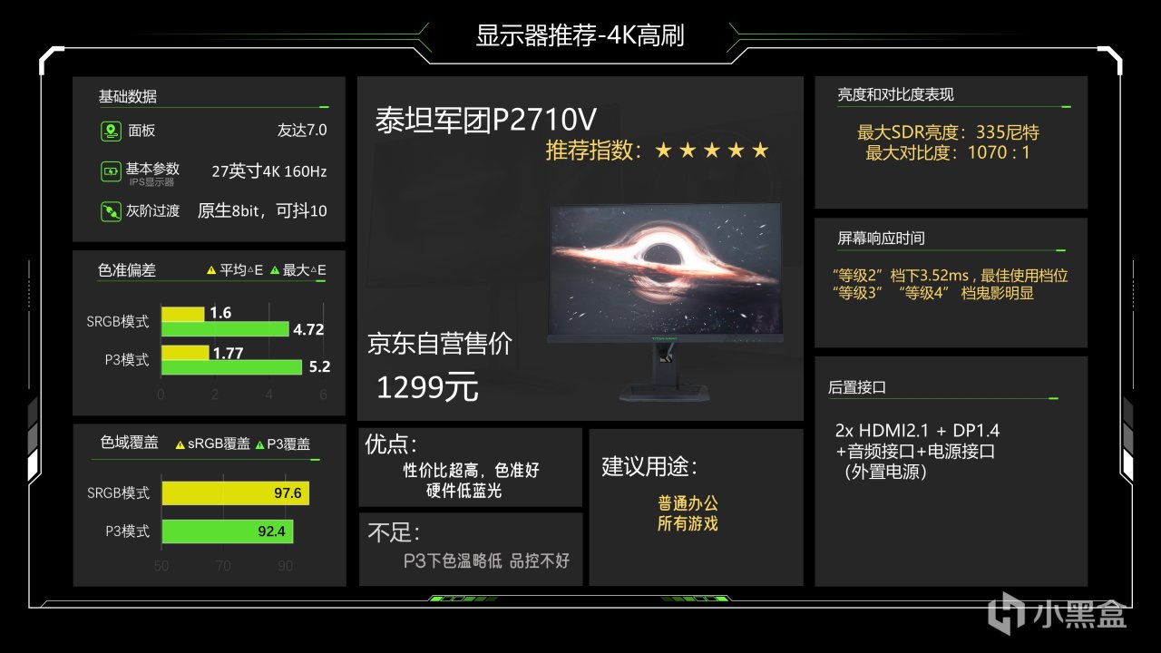 价格1299元,这个价格已经很久没动了估计是快降到底了,仔细看整体调教也还可以,最大SDR亮度可以达到335尼特了,对比度能略超1000:1的IPS典型值,色准数据还好,能满足游戏和看电影需求,相对来说它在P3下6200K级别的色温成了最大的缺点,会造成屏幕偏黄,当然这也看大家长期以来用的是什么色温的灯光,如果你用暖光灯较多的话影响就不大,它的背光肯定是不好的,当然它还有另一个缺点就是品控不太好,便宜又高效,那品控肯定就需要抽奖了