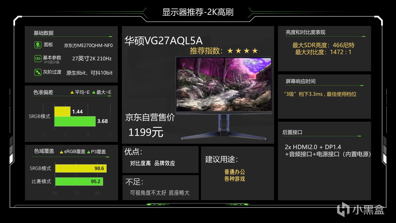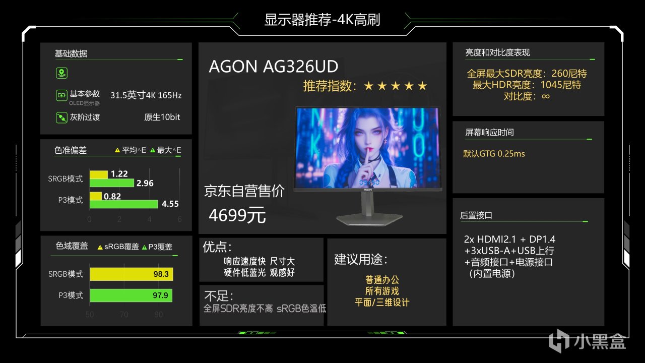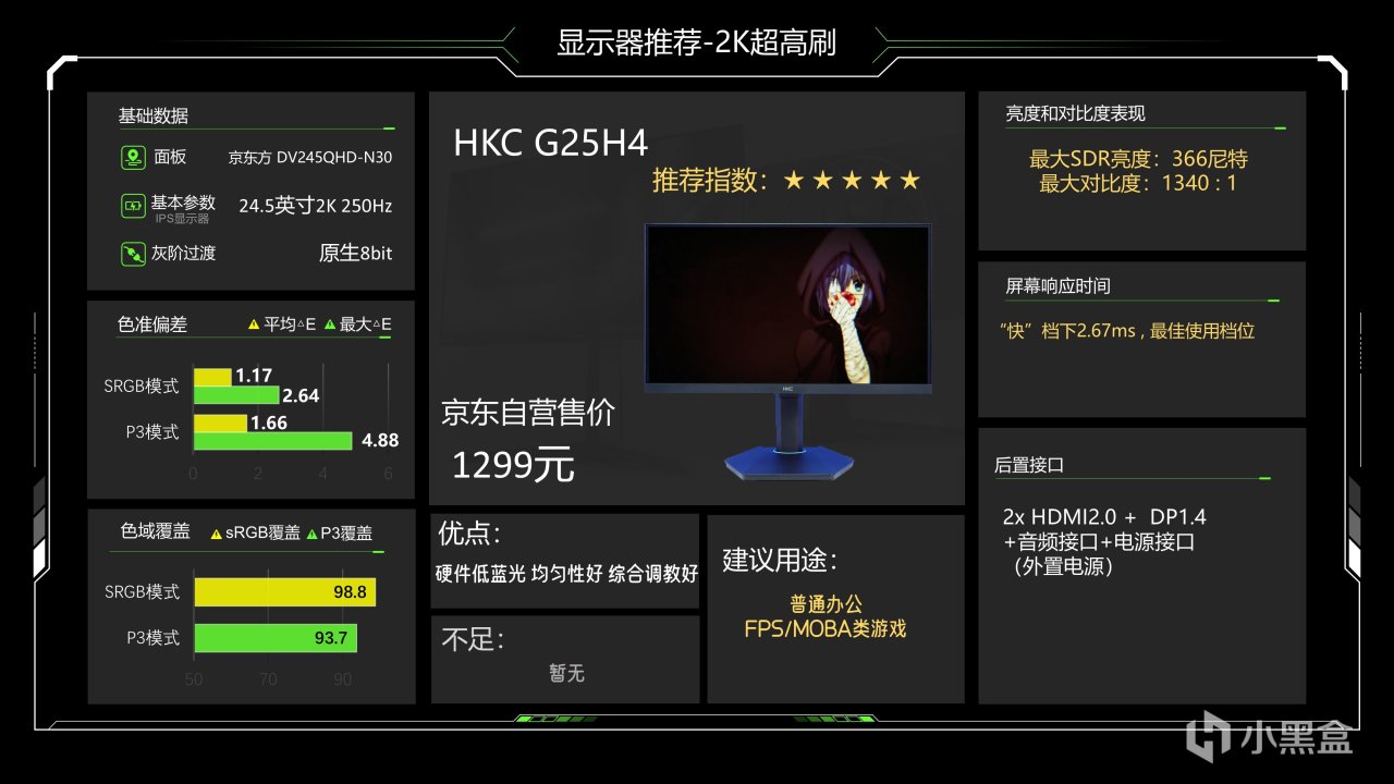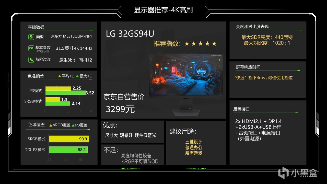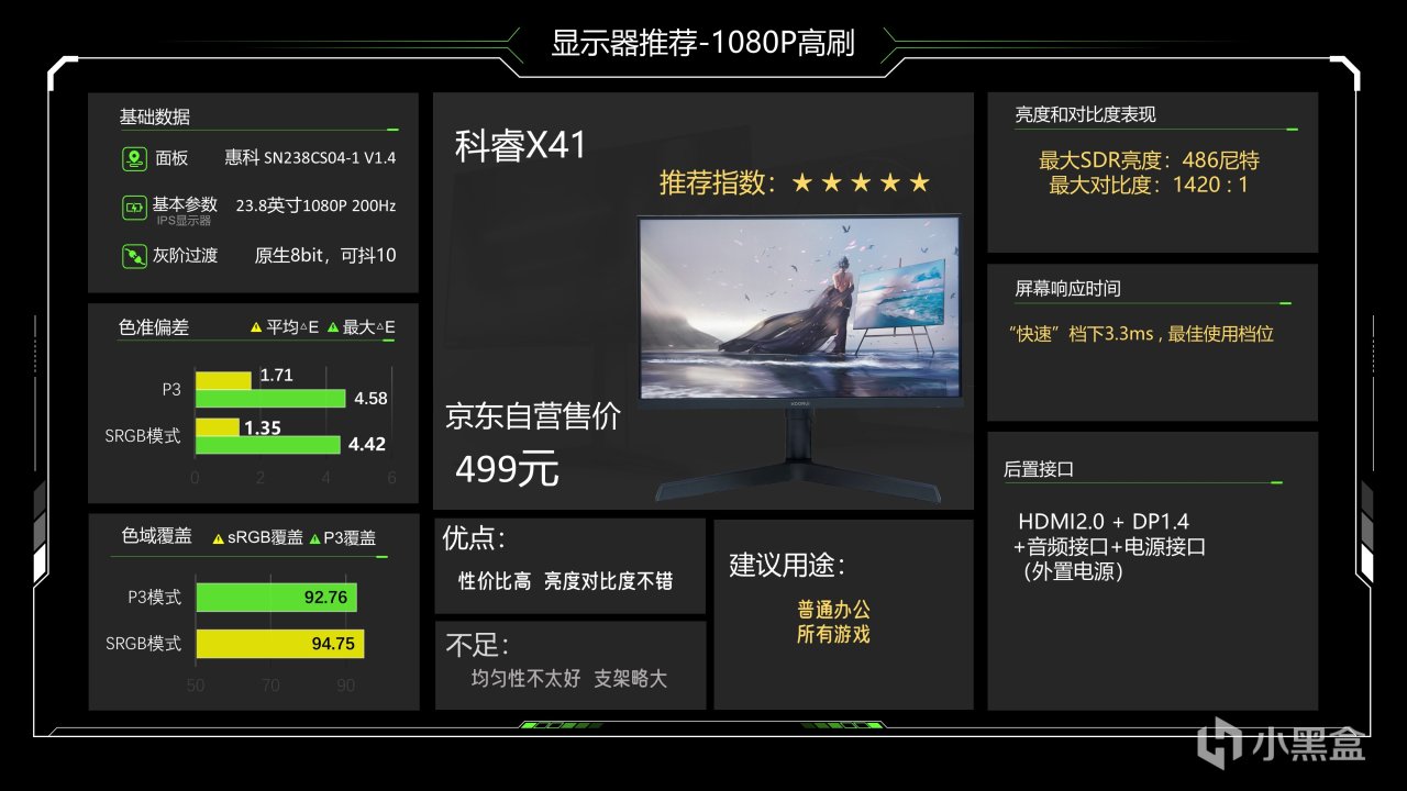 价格1299元,这个价格已经很久没动了估计是快降到底了,仔细看整体调教也还可以,最大SDR亮度可以达到335尼特了,对比度能略超1000:1的IPS典型值,色准数据还好,能满足游戏和看电影需求,相对来说它在P3下6200K级别的色温成了最大的缺点,会造成屏幕偏黄,当然这也看大家长期以来用的是什么色温的灯光,如果你用暖光灯较多的话影响就不大,它的背光肯定是不好的,当然它还有另一个缺点就是品控不太好,便宜又高效,那品控肯定就需要抽奖了