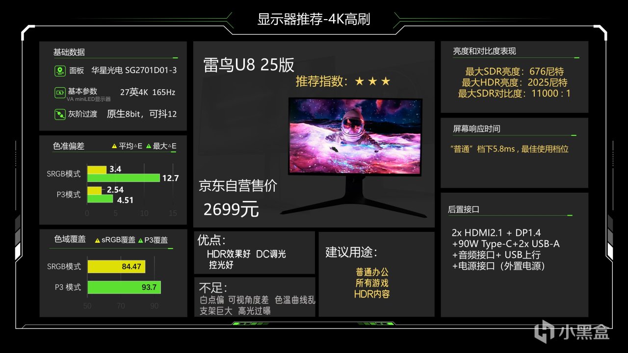 现在价格2699元,性价比非常不错,色彩调教方面比较抽奖,运气不好会抽到我这种sRGB表现很差的型号,不过miniLED显示器的重点还是HDR表现,U8 25版的控光和HDR亮度都非常出色,这台显示器是自动HDR,HDR色准倒是比较一般(也算偏上的水平了),EOTF曲线调教还行,不过BT2020覆盖率可以达到87.07%,很强。响应时间比较一般。肯定会有观众会对U8 25版和U9的选择很纠结,我认为U9目前跟U8 25版价格差距太大了,U8 25版单纯一个sRGB差我认为并不能抹掉800元左右的价差,我觉得这一点不足最多值三百,U8的控光表现还好于U9,响应速度不比U9差,所以我觉得U8性价比高