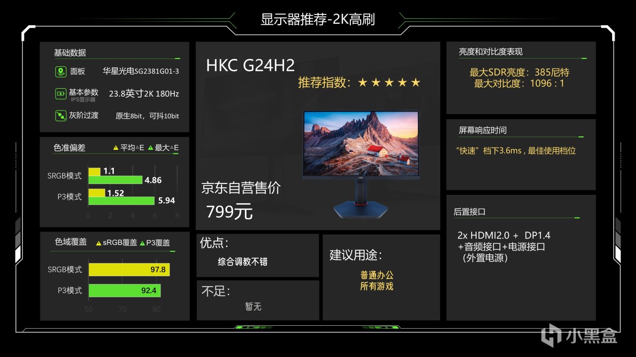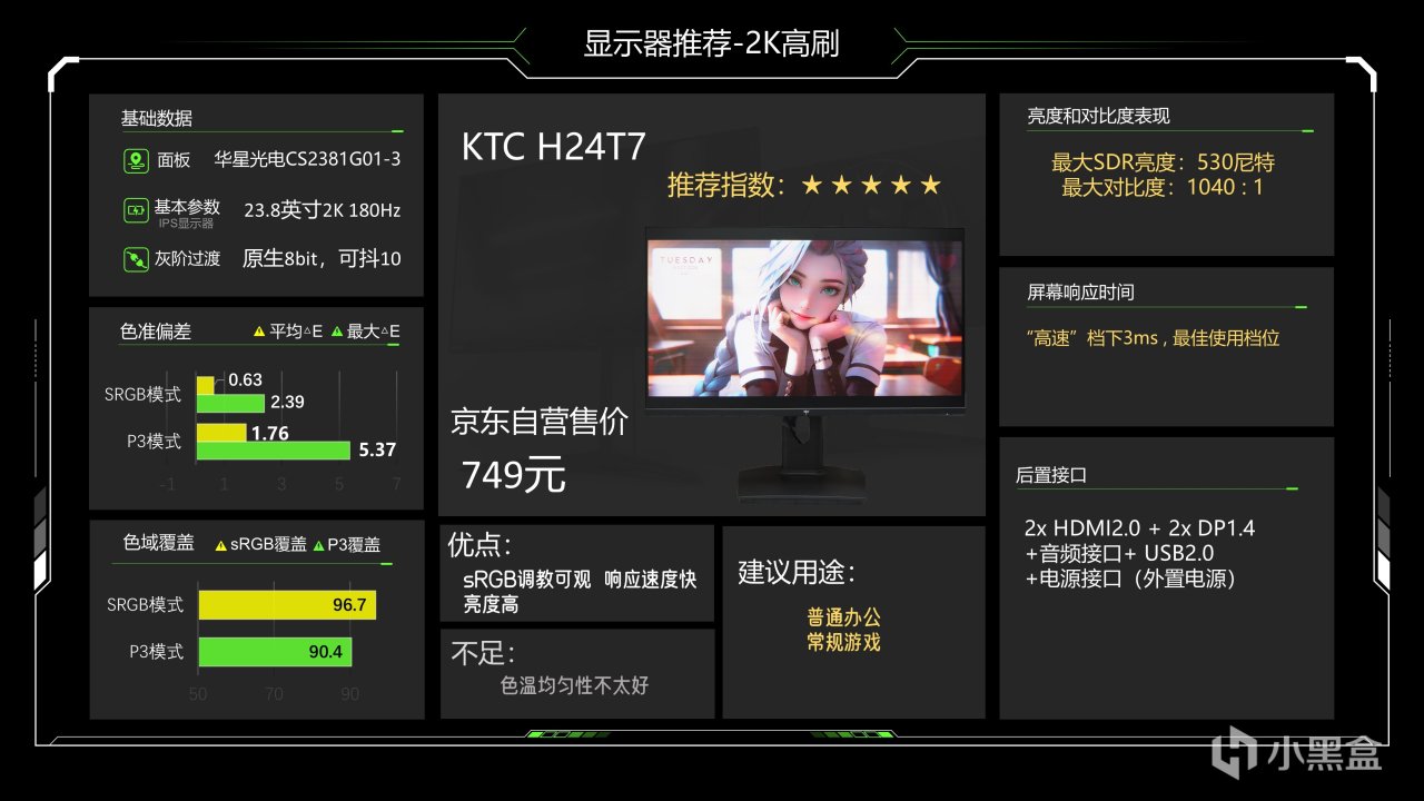 749元的24英寸2K高刷,这台显示器可以先说缺点,就是色温均匀性不太好,可能会稍微影响到观感,其他方面表现还不错,色准极其优秀,最大SDR亮度可以达到530尼特,非常高,响应速度可以做到3ms,也勉强达到T1级别,P3色域不是很广,但对很多游戏是基本够了,它的综合实力要比同价位的27英寸2K高刷要强一档,如果不是很看中尺寸的话这个系列的显示器选择性可以优于入门级27英寸2K高刷